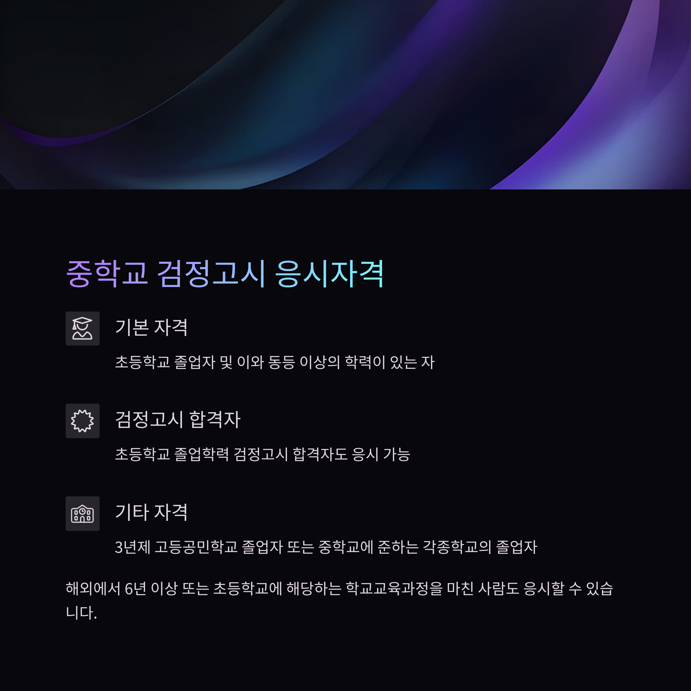 - 중졸 검정고시: 국내 및 외국에서 6년 이상 또는 초등학교에 해당하는 학교교육과정을 마친 사람