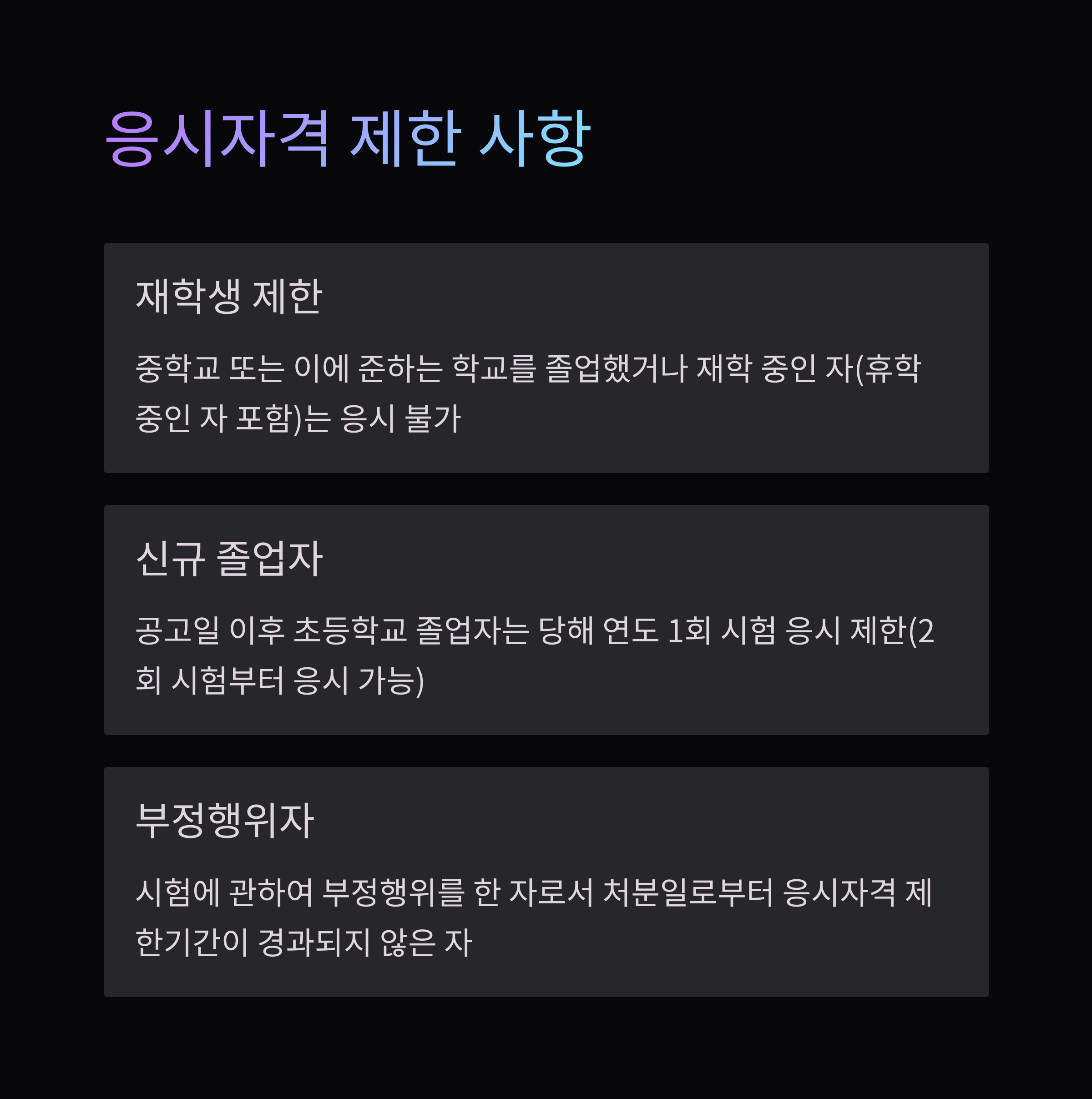 - 공고일 이후 초등학교 졸업자(당해 연도 1회 시험 응시 제한, 2회 시험부터 응시 가능)