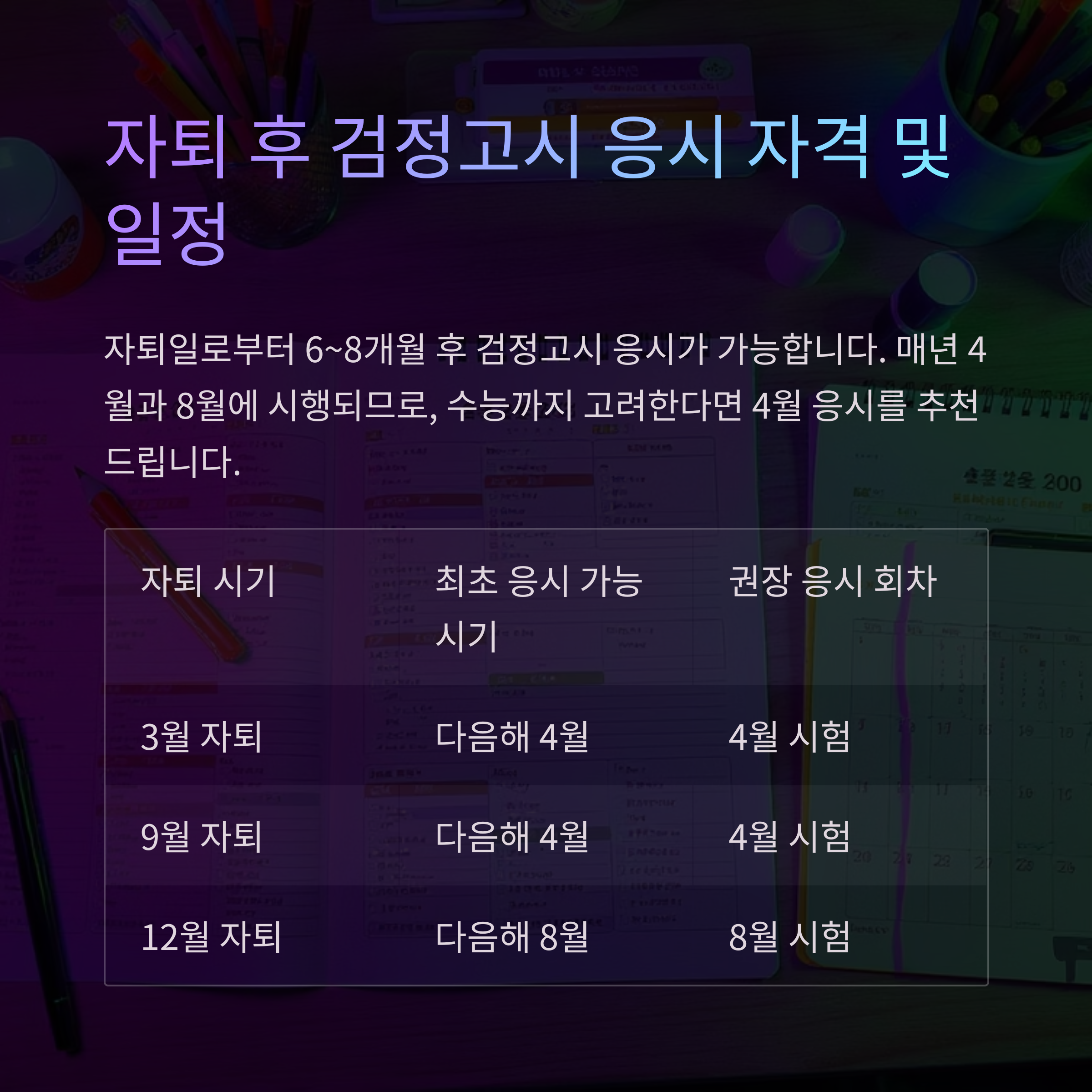 자퇴일로부터 6~8개월 후 검정고시 응시가 가능합니다. 매년 4월과 8월에 시행되므로, 수능까지 고려한다면 4월 응시를 추천드립니다.