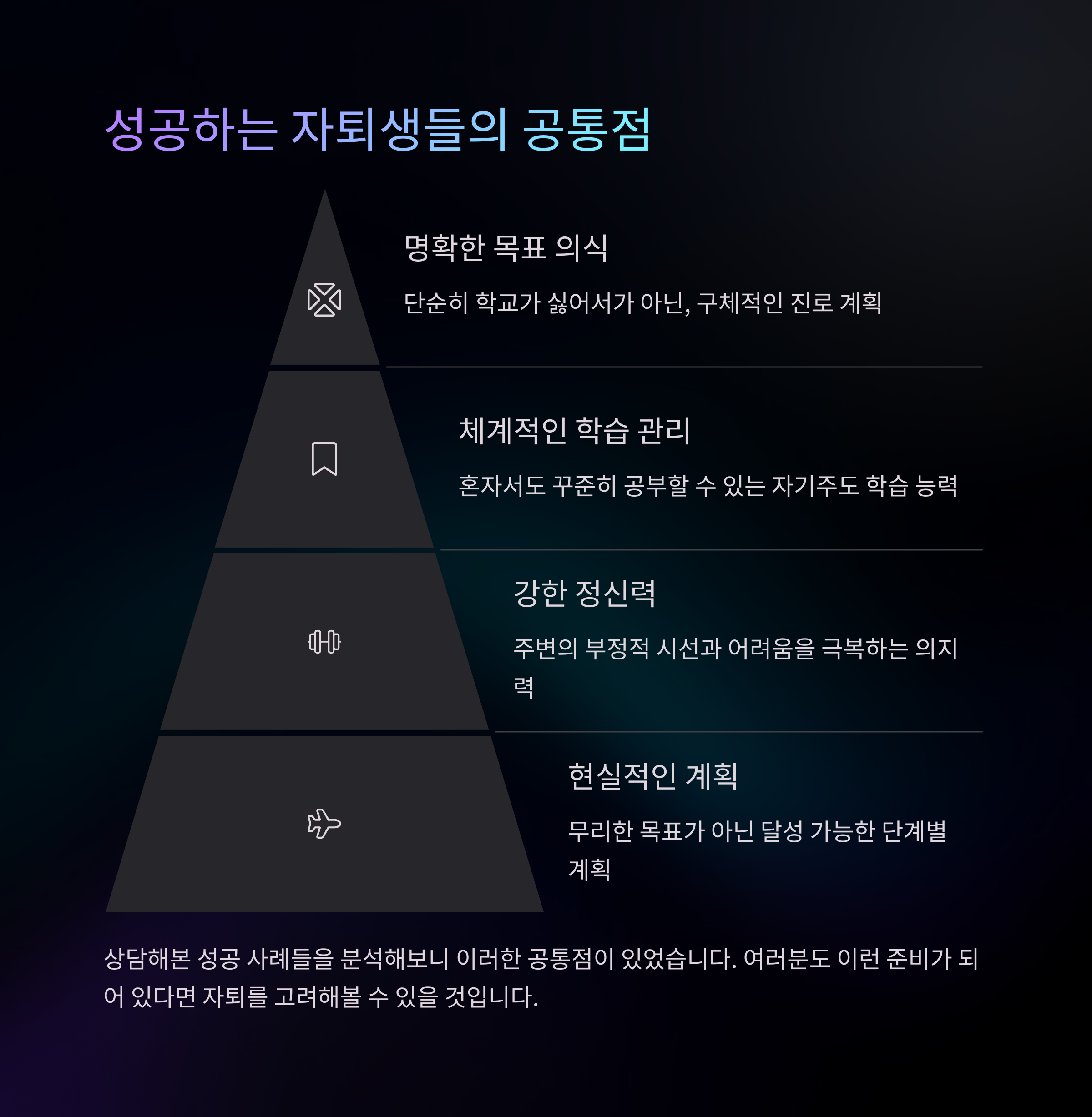 자퇴는 분명 쉽지 않은 선택입니다. 하지만 충분한 준비와 확고한 의지가 있다면 오히려 더 나은 결과를 얻을 수도 있죠. 무엇보다 중요한 건 성급한 결정보다는 신중한 판단과 체계적인 계획입니다.
