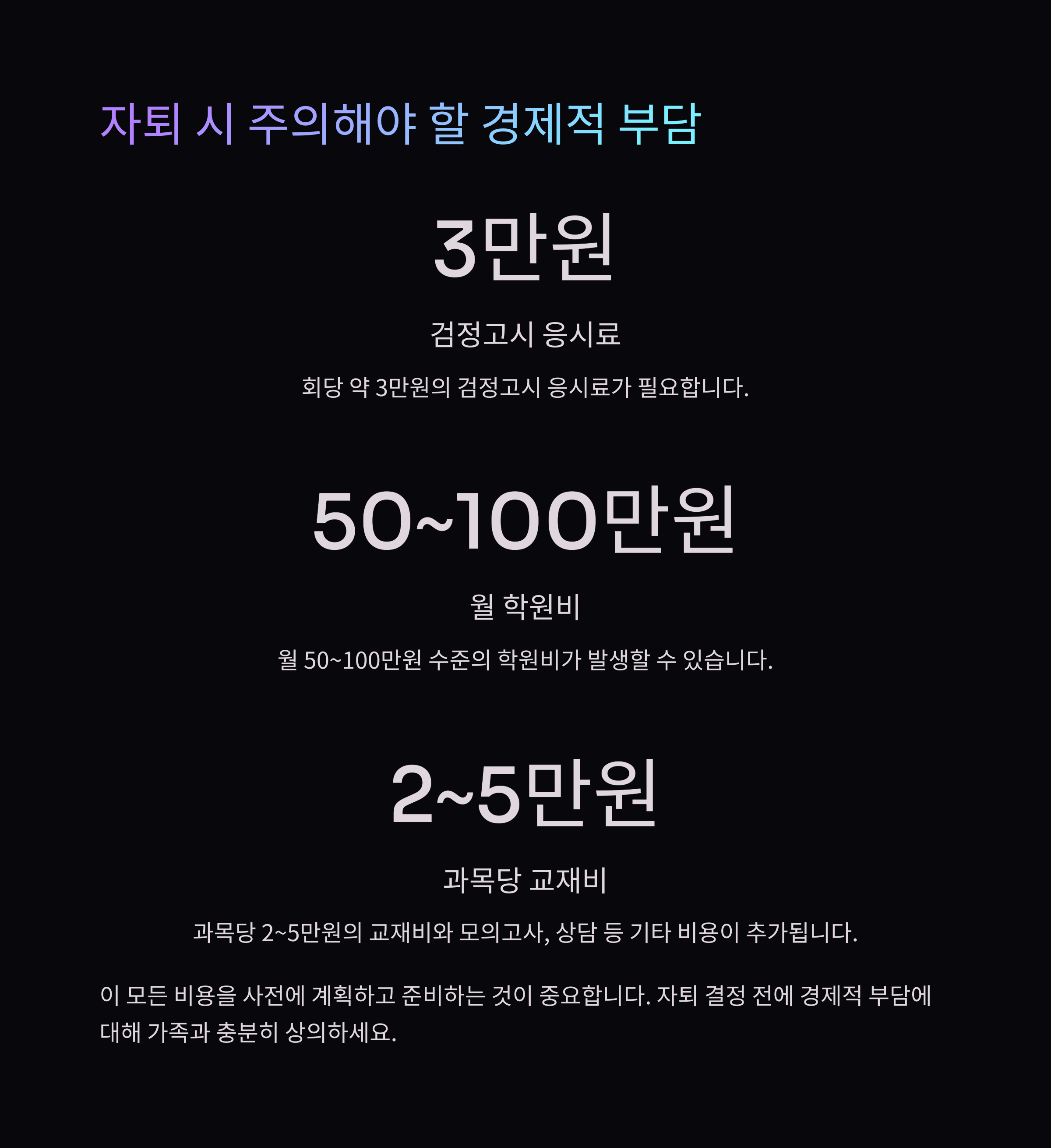 | 경제적 준비 | 검정고시, 학원비 등 비용 | 중간 |