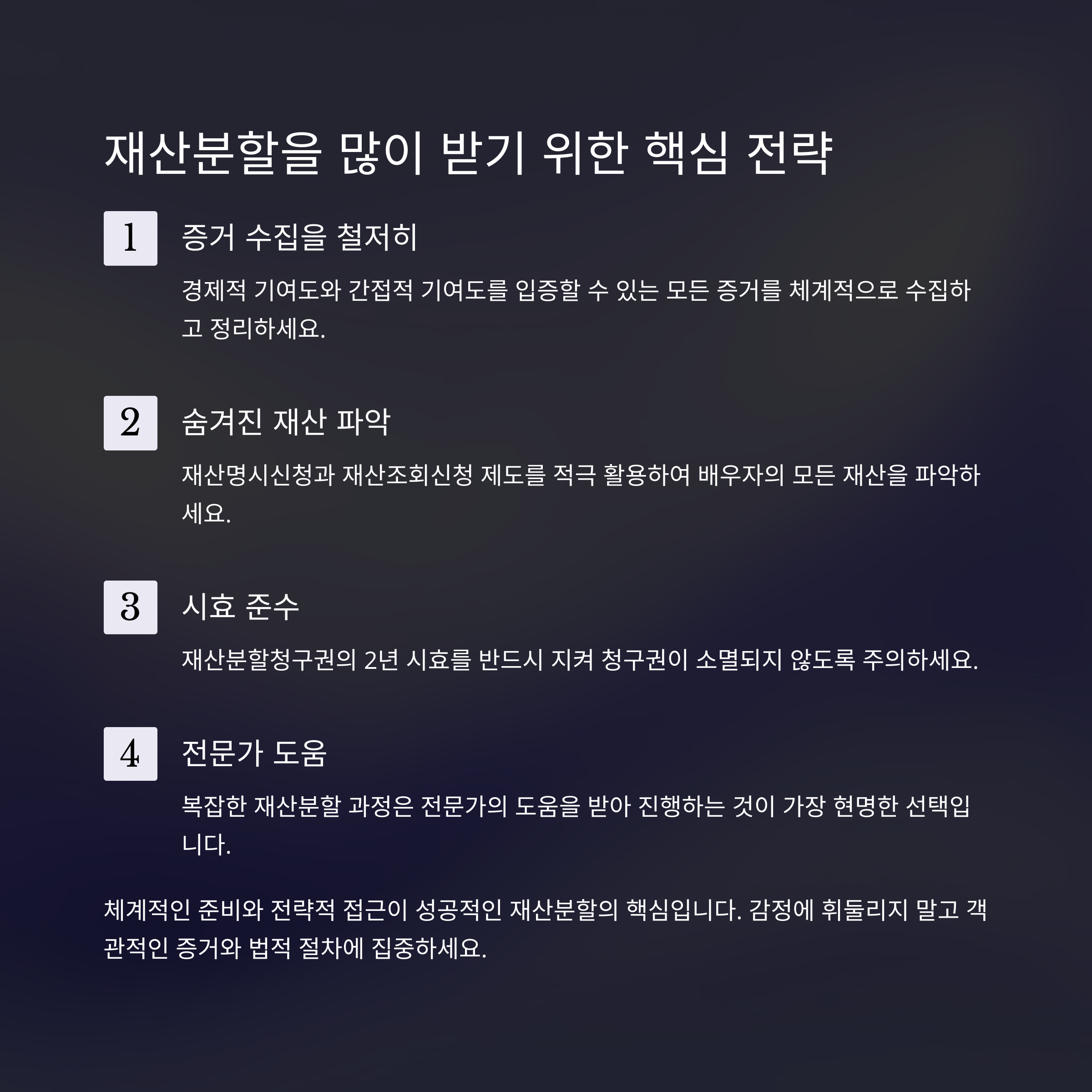 실제 경험상 재산분할을 많이 받기 위해서는 다음 사항들을 체계적으로 준비하셔야 합니다.