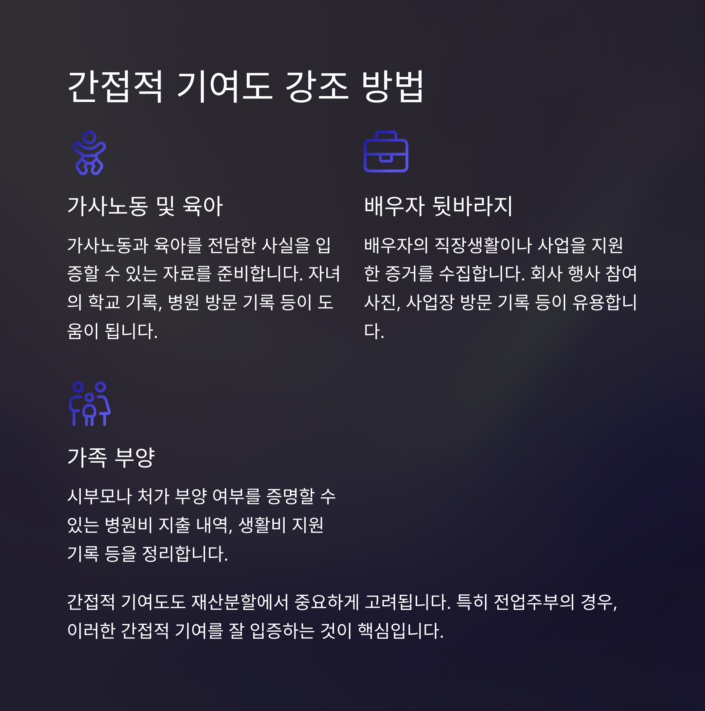 지금까지 이혼 재산분할의 전 과정을 살펴보았습니다. 핵심은 체계적인 준비와 객관적인 증거 수집입니다. 특히 기여도 입증이 가장 중요하며, 직접적 경제 기여뿐만 아니라 가사노동과 육아 등의 간접적 기여도 꼼꼼히 정리하시면 됩니다.