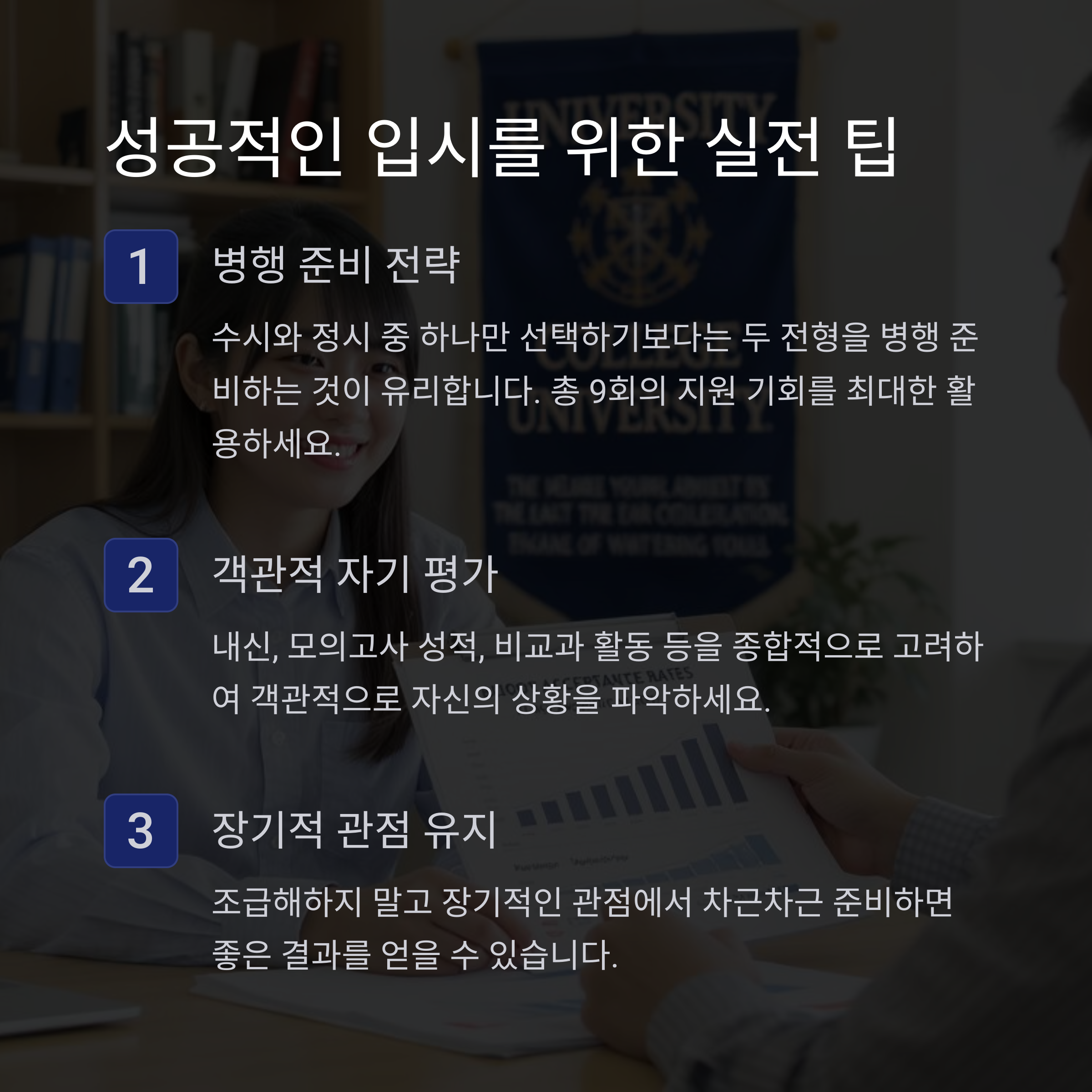 마지막으로 제가 경험한 바를 토대로 몇 가지 실전 팁을 말씀드릴게요. 우선 수시와 정시 중 하나만 선택하기보다는 두 전형을 병행 준비하는 것이 유리합니다. 총 9회의 지원 기회를 최대한 활용하시면 되시겠습니다.