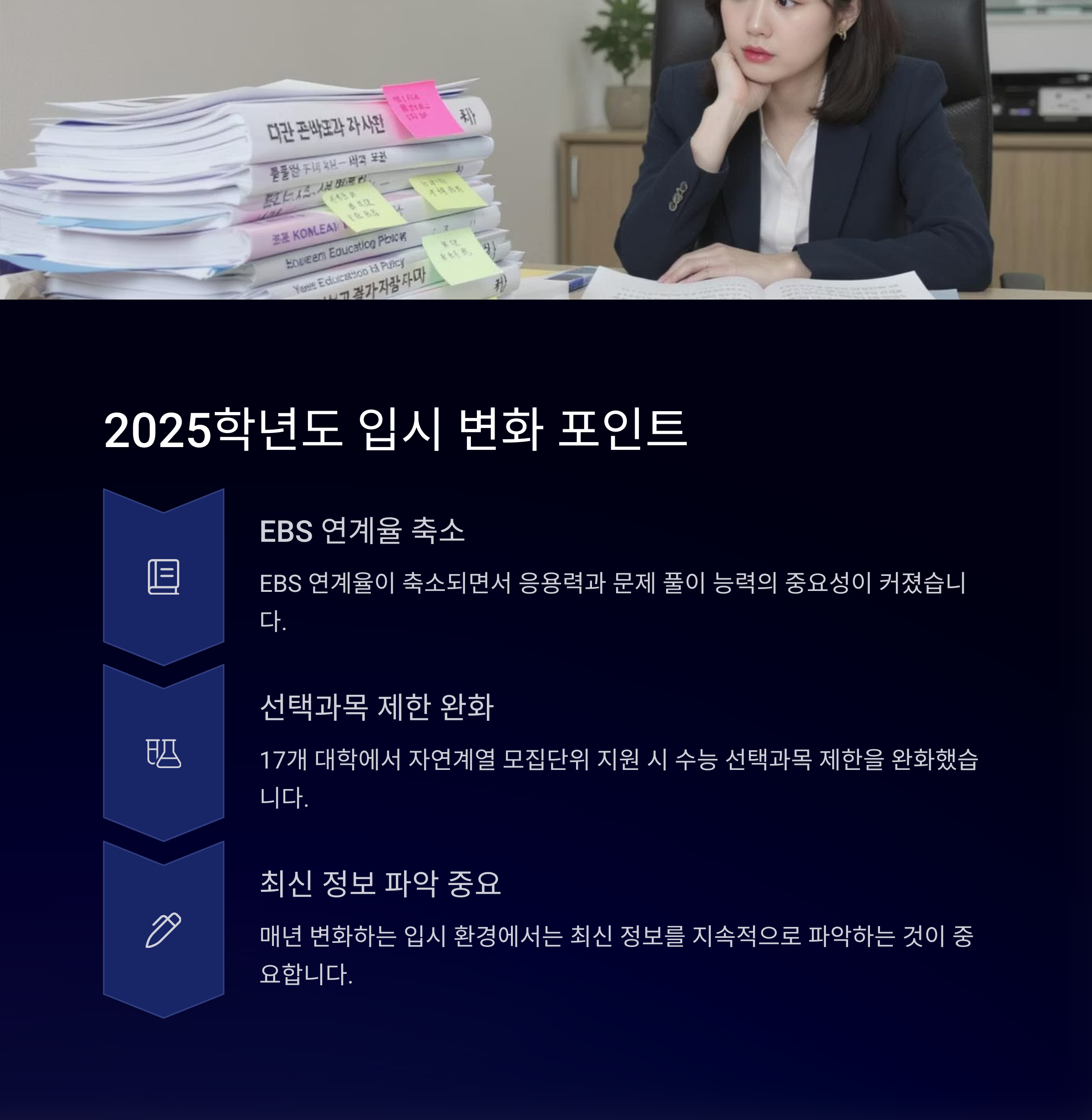 올해 입시에서 주목할 만한 변화가 있어요. EBS 연계율이 축소되면서 응용력과 문제 풀이 능력의 중요성이 커졌습니다. 또한 17개 대학에서 자연계열 모집단위 지원 시 수능 선택과목 제한을 완화했어요.