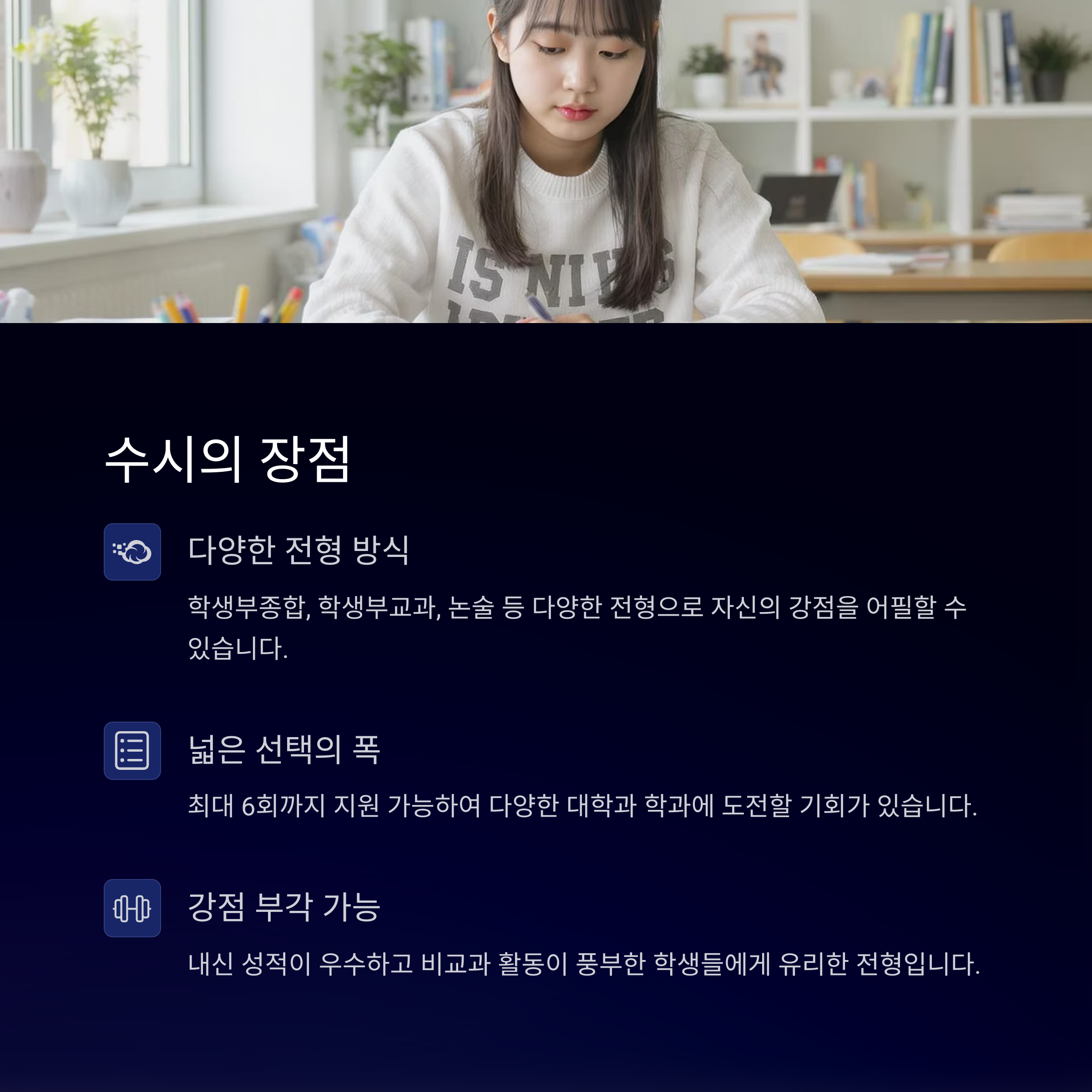 수시의 가장 큰 장점은 다양한 전형으로 자신의 강점을 어필할 수 있다는 점입니다. 내신 성적이 우수하고 비교과 활동이 풍부하다면 수시로 충분히 좋은 결과를 얻을 수 있어요. 또한 최대 6회까지 지원 가능해 선택의 폭이 넓다는 것도 매력적이죠.