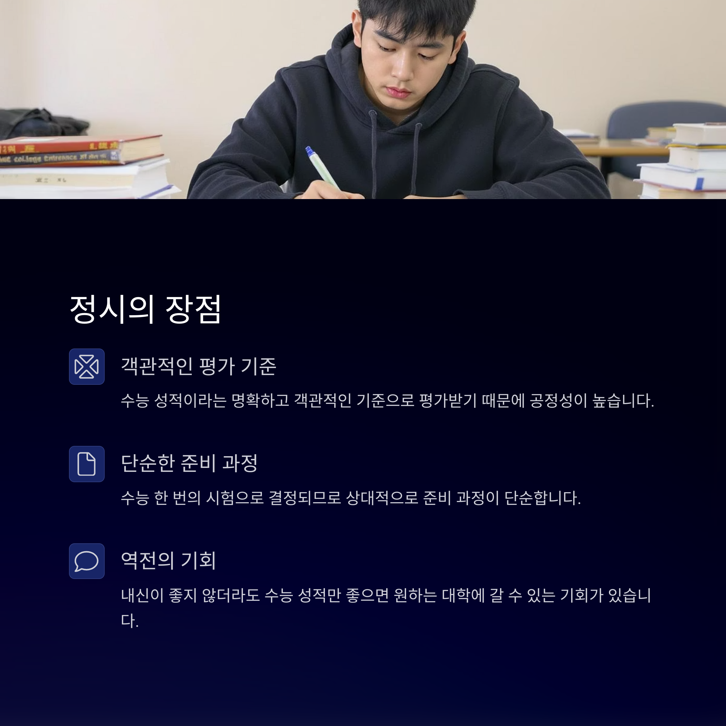 정시의 가장 큰 장점은 객관적이고 명확한 평가 기준이라는 점입니다. 수능 성적만 좋다면 원하는 대학에 갈 수 있는 확실한 길이죠. 또한 한 번의 시험으로 모든 것이 결정되므로 상대적으로 준비가 간단하다고 할 수 있어요.