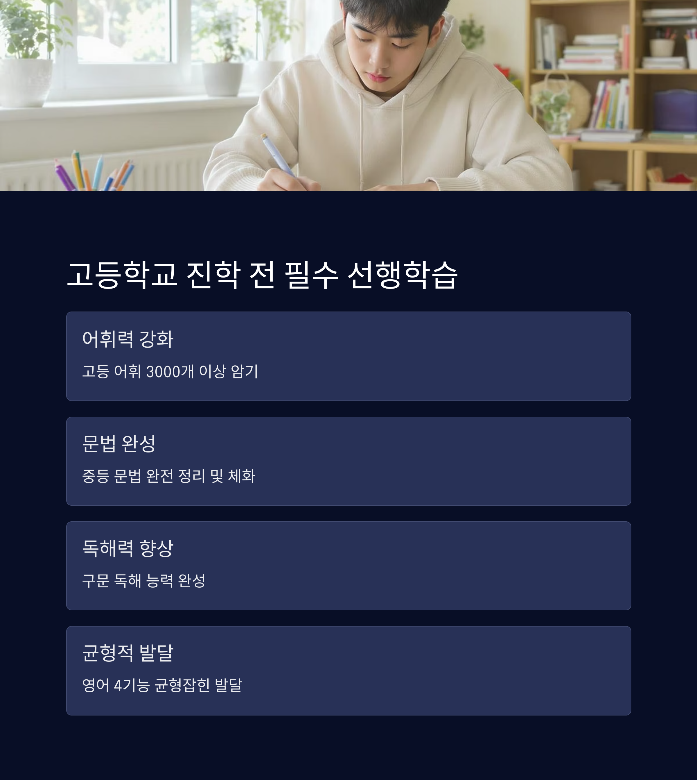 예비고1 겨울방학이 가장 중요한 시기입니다. 이때 고등 단어 암기와 함께 중등 문법을 완벽히 정리하시면 되시겠습니다. 특히 내신 준비 기간을 기존 한 달에서 1-2주로 단축하는 연습도 필요합니다.