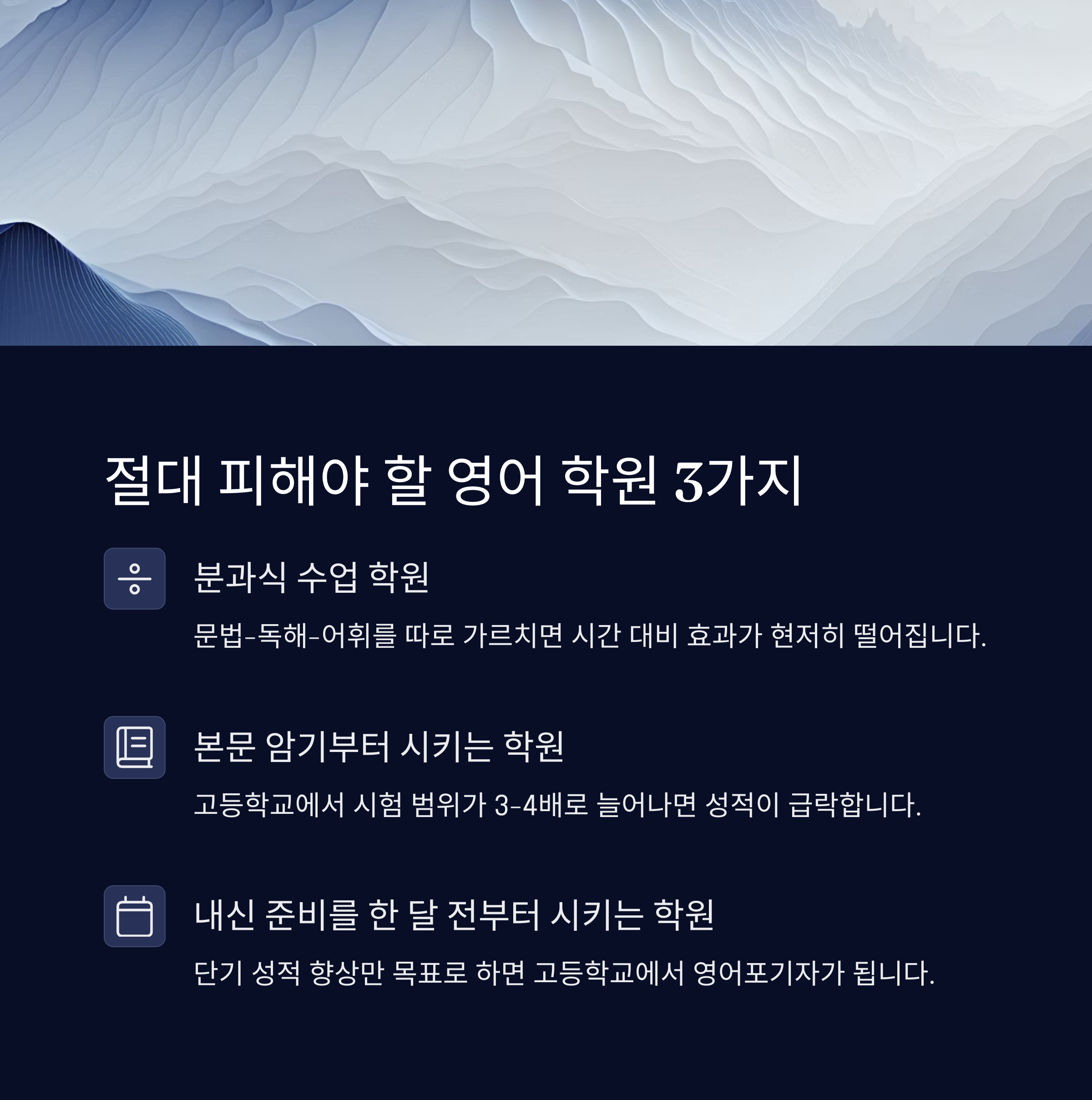 | 장기 내신 준비 학원 | 잘못된 학습 습관 형성 | 영어 포기자 양산 |