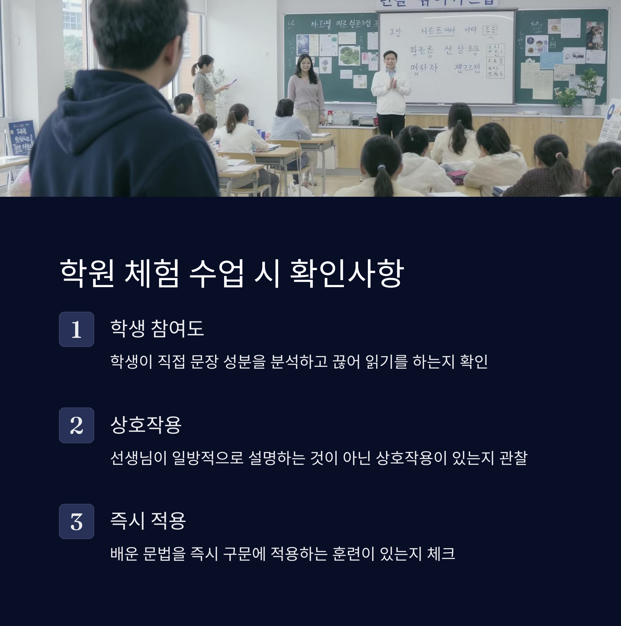 이처럼 구체적인 질문을 통해 학원의 교육 철학과 시스템을 파악하는 것이 중요합니다.