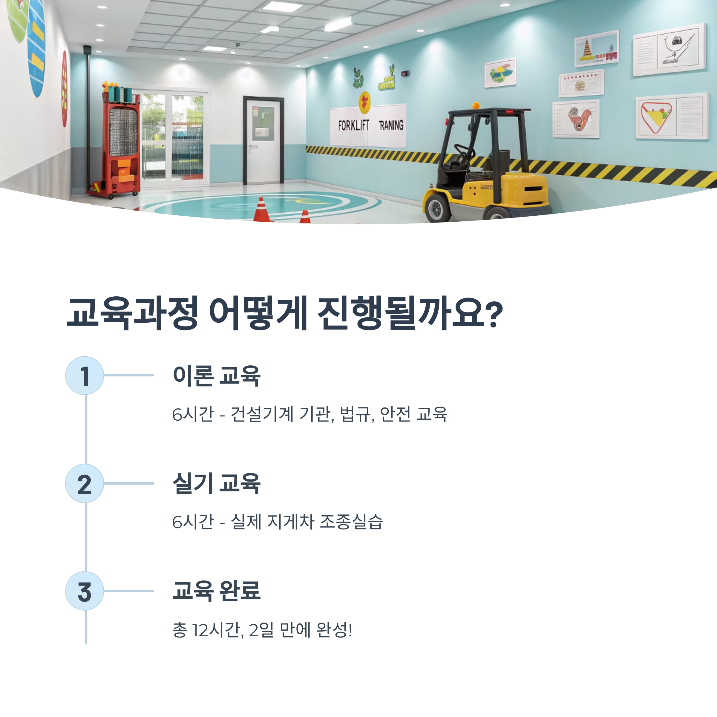 이론 교육 6시간에서는 건설기계 기관, 전기 및 작업 장치, 건설기계 관리법, 도로 통행방법, 유압 일반에 대해 배우게 됩니다. 실기 교육 6시간에서는 실제 지게차 조종실습을 진행하죠.