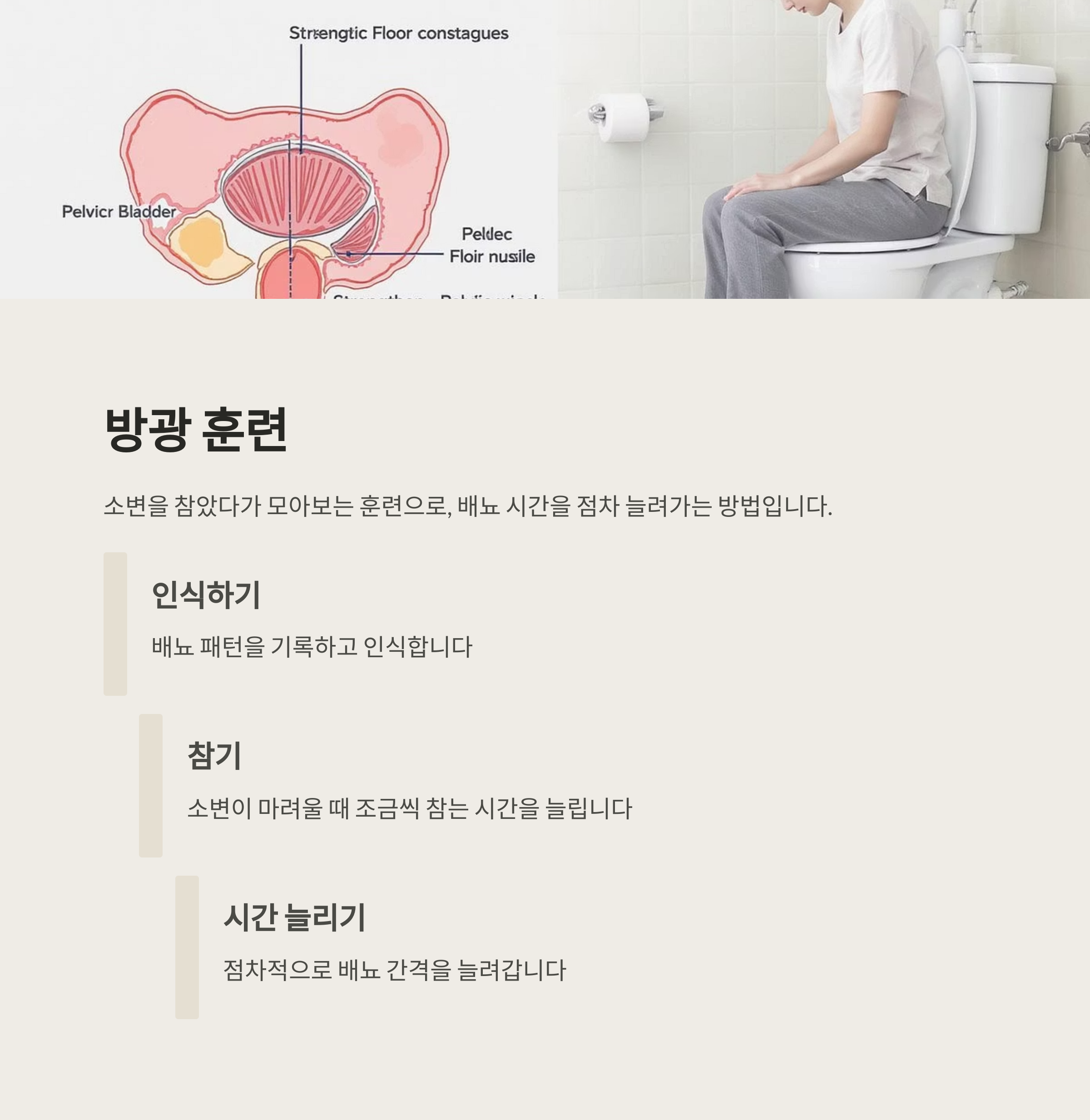 소변을 참았다가 모아보는 훈련으로, 배뇨 시간을 점차 늘려가는 방법입니다.