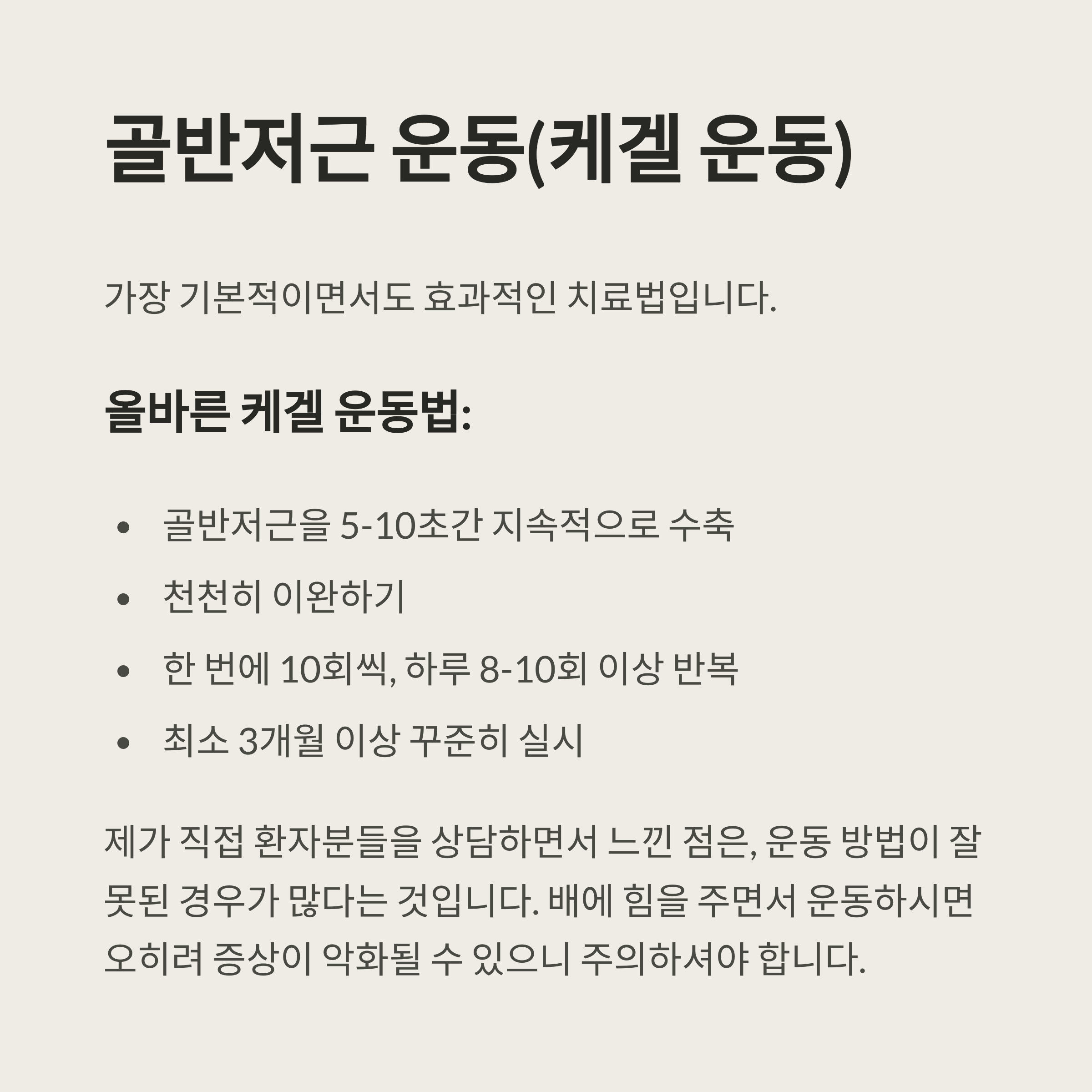 제가 직접 환자분들을 상담하면서 느낀 점은, 운동 방법이 잘못된 경우가 많다는 것입니다. 배에 힘을 주면서 운동하시면 오히려 증상이 악화될 수 있으니 주의하셔야 합니다.