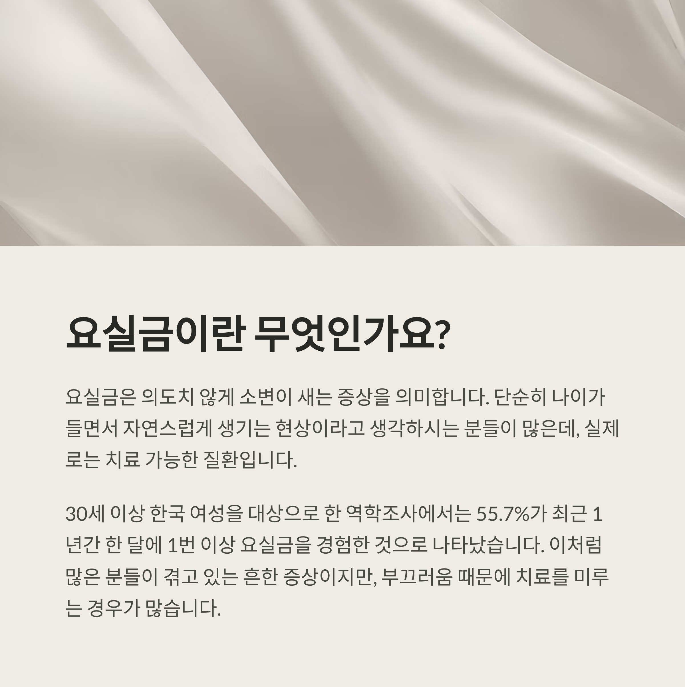 요실금은 의도치 않게 소변이 새는 증상을 의미합니다. 단순히 나이가 들면서 자연스럽게 생기는 현상이라고 생각하시는 분들이 많은데, 실제로는 치료 가능한 질환입니다.