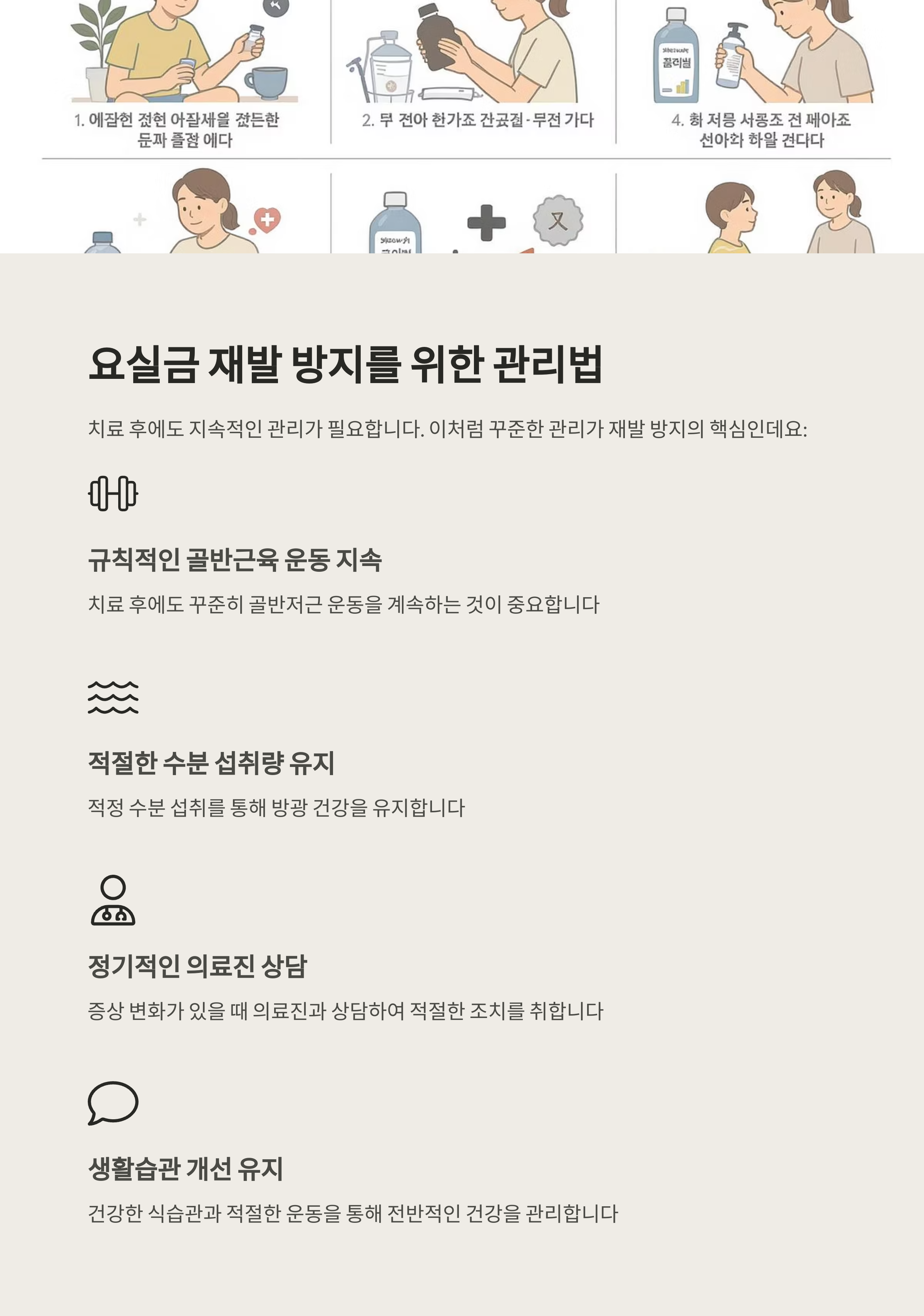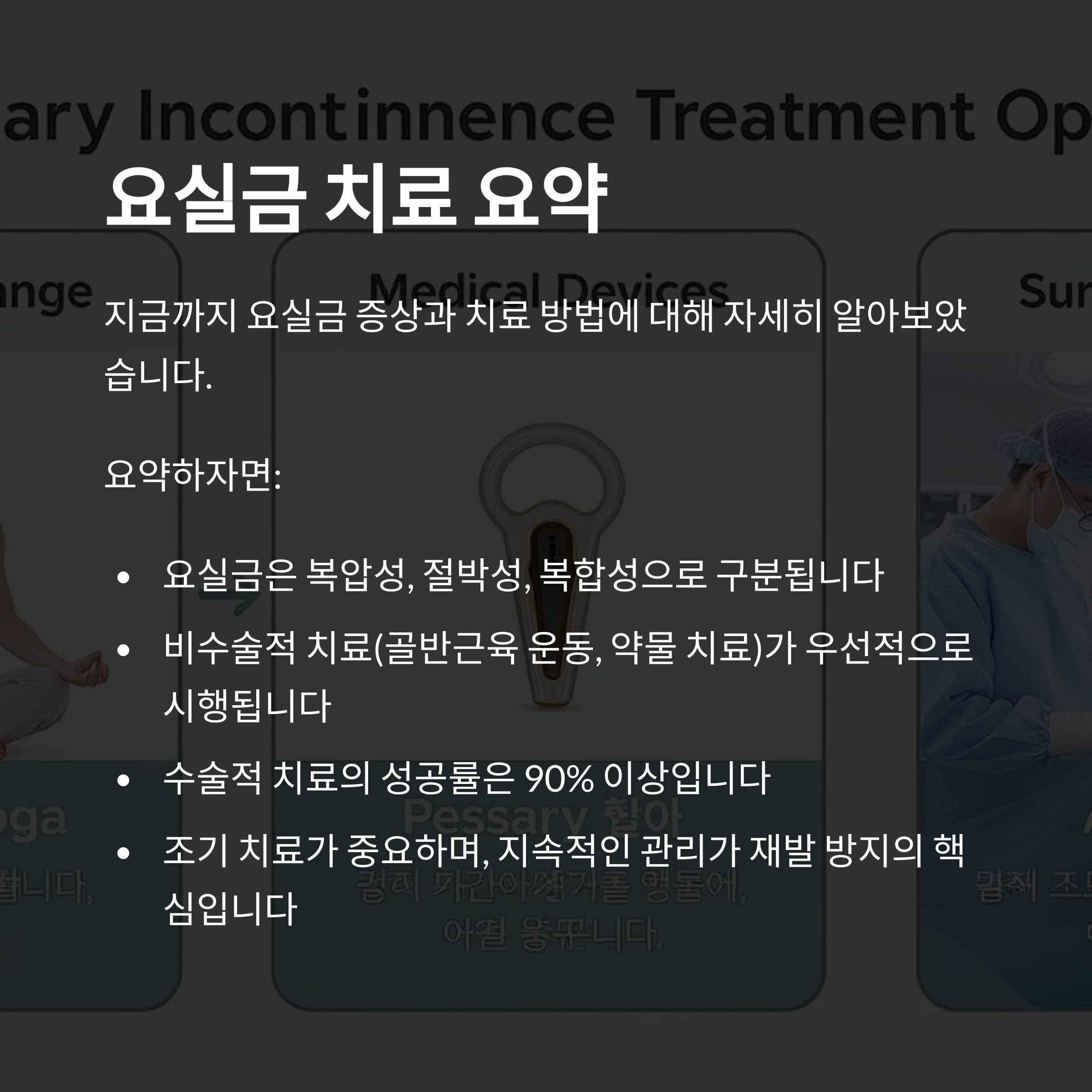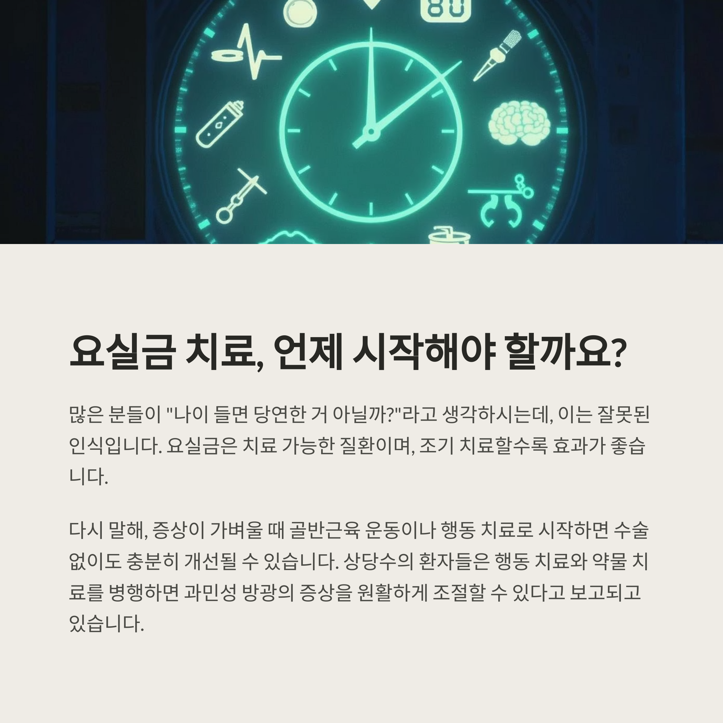 다시 말해, 증상이 가벼울 때 골반근육 운동이나 행동 치료로 시작하면 수술 없이도 충분히 개선될 수 있습니다.