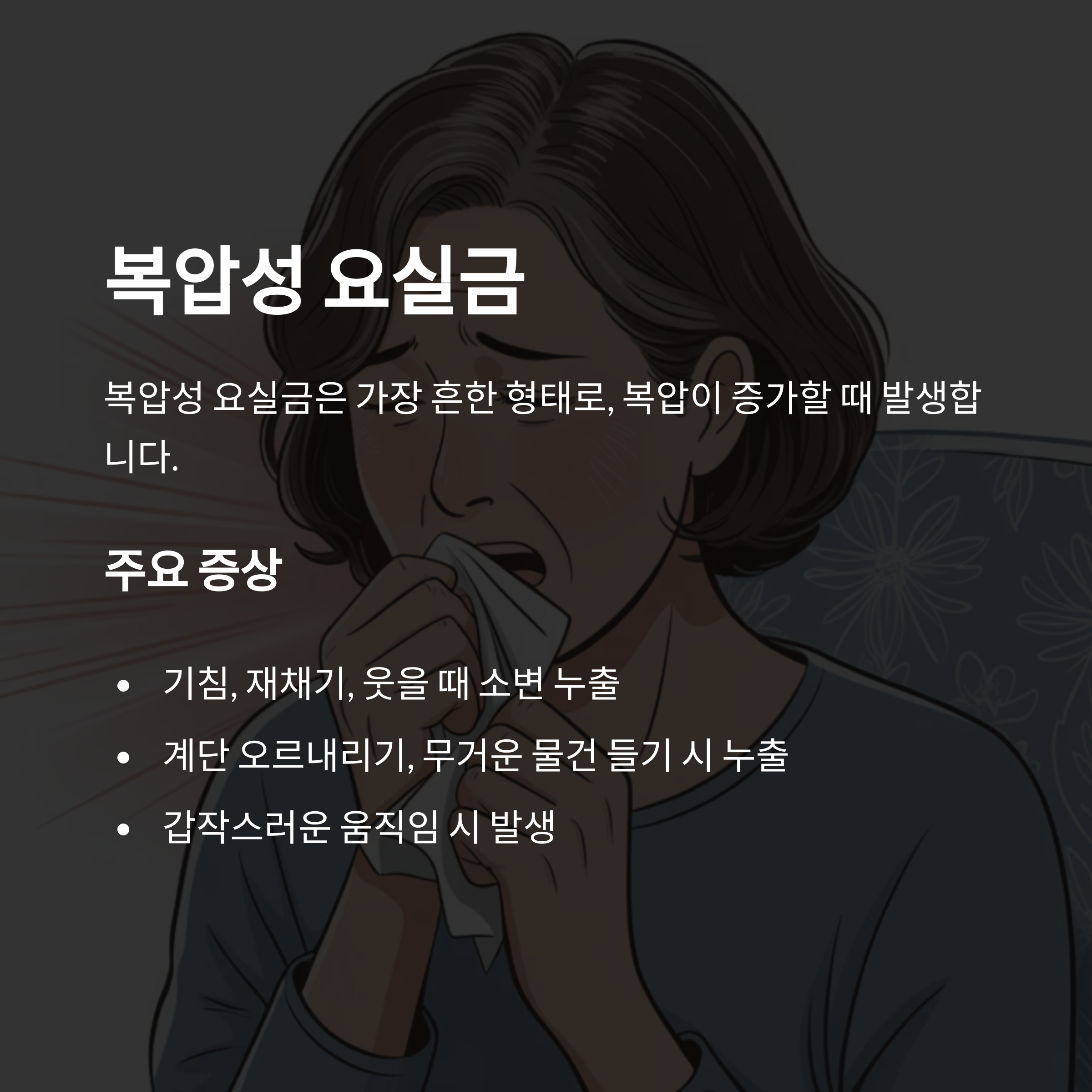 복압성 요실금은 가장 흔한 형태로, 복압이 증가할 때 발생합니다.
