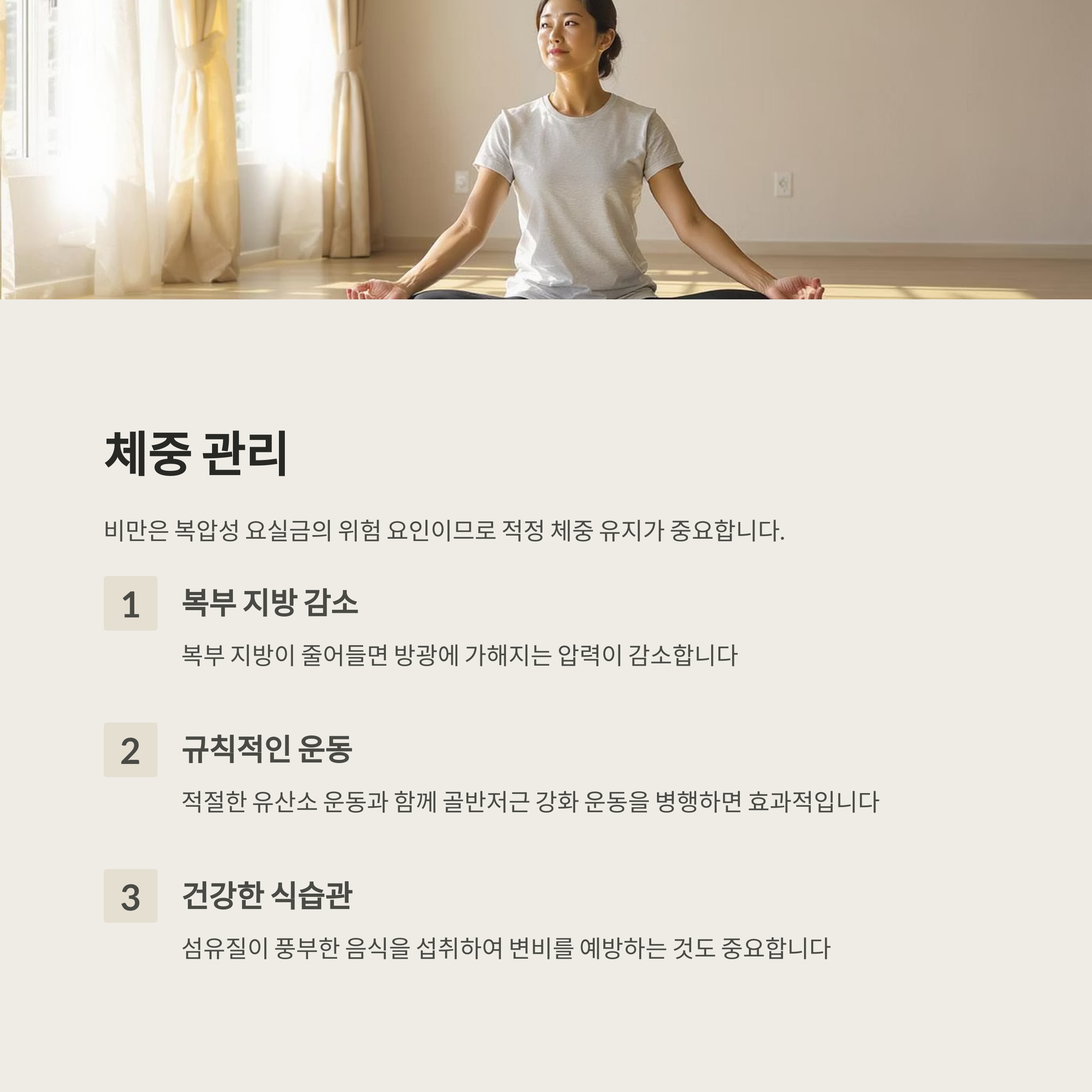 비만은 복압성 요실금의 위험 요인이므로 적정 체중 유지가 중요합니다.