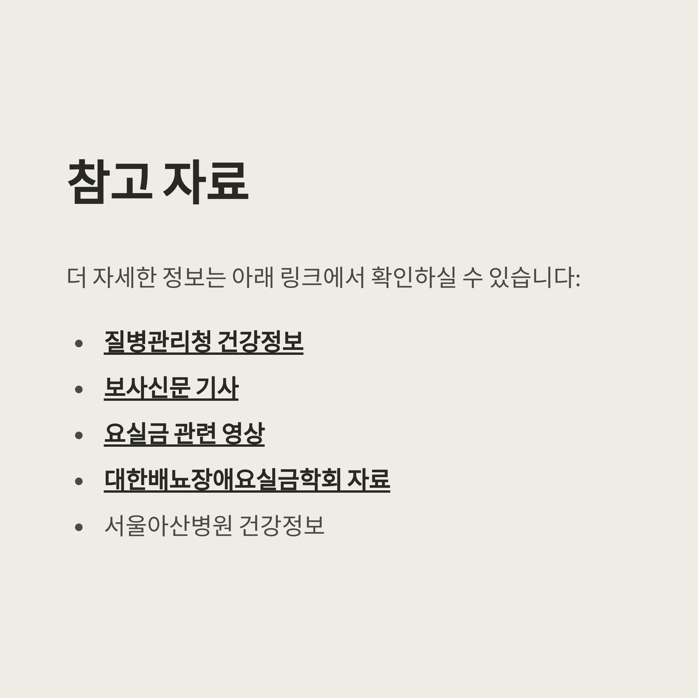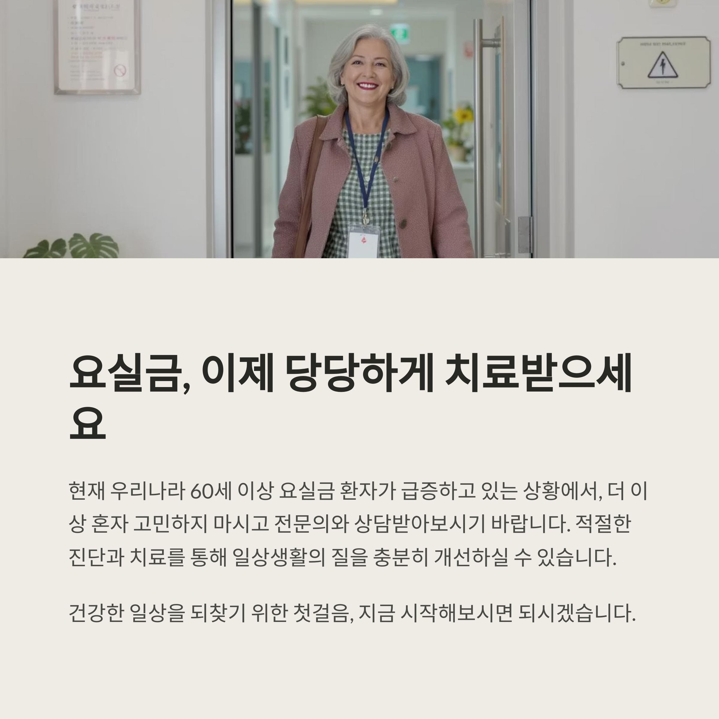 현재 우리나라 60세 이상 요실금 환자가 급증하고 있는 상황에서, 더 이상 혼자 고민하지 마시고 전문의와 상담받아보시기 바랍니다. 적절한 진단과 치료를 통해 일상생활의 질을 충분히 개선하실 수 있습니다.