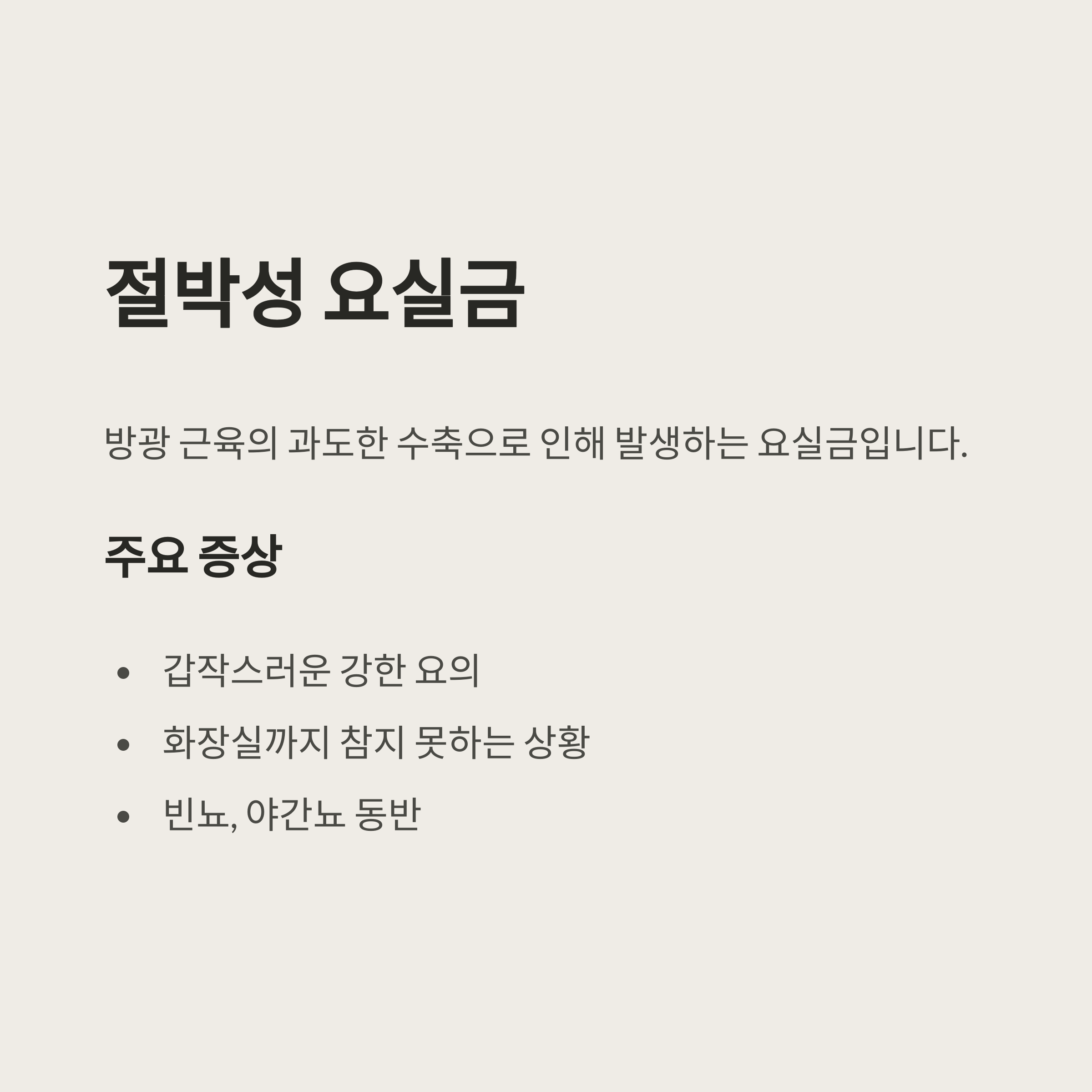 | 절박성 | 방광 과민성 | 급한 요의, 빈뇨 | 약물 치료 |