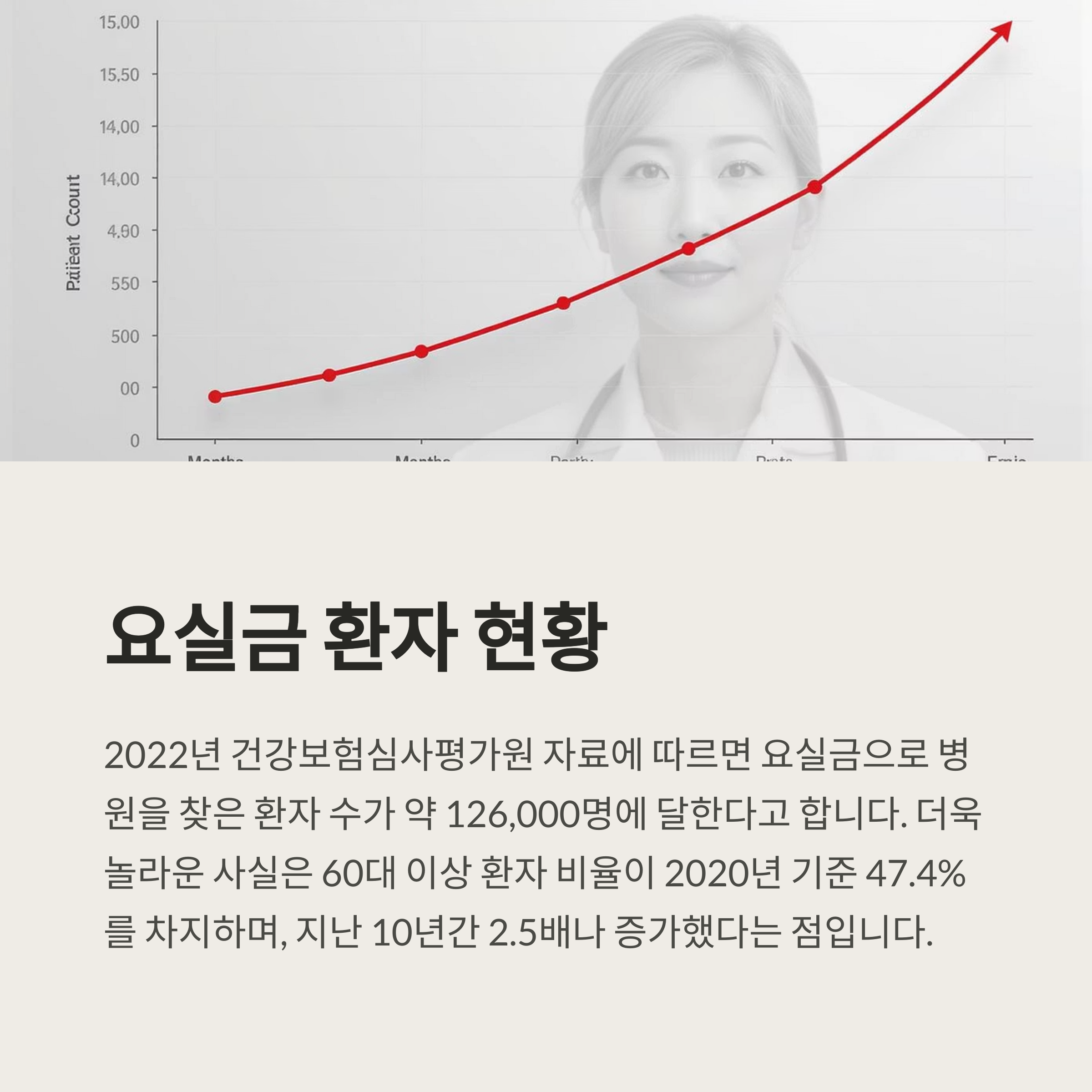 2022년 건강보험심사평가원 자료에 따르면 요실금으로 병원을 찾은 환자 수가 약 126,000명에 달한다고 합니다. 더욱 놀라운 사실은 60대 이상 환자 비율이 2020년 기준 47.4%를 차지하며, 지난 10년간 2.5배나 증가했다는 점입니다.