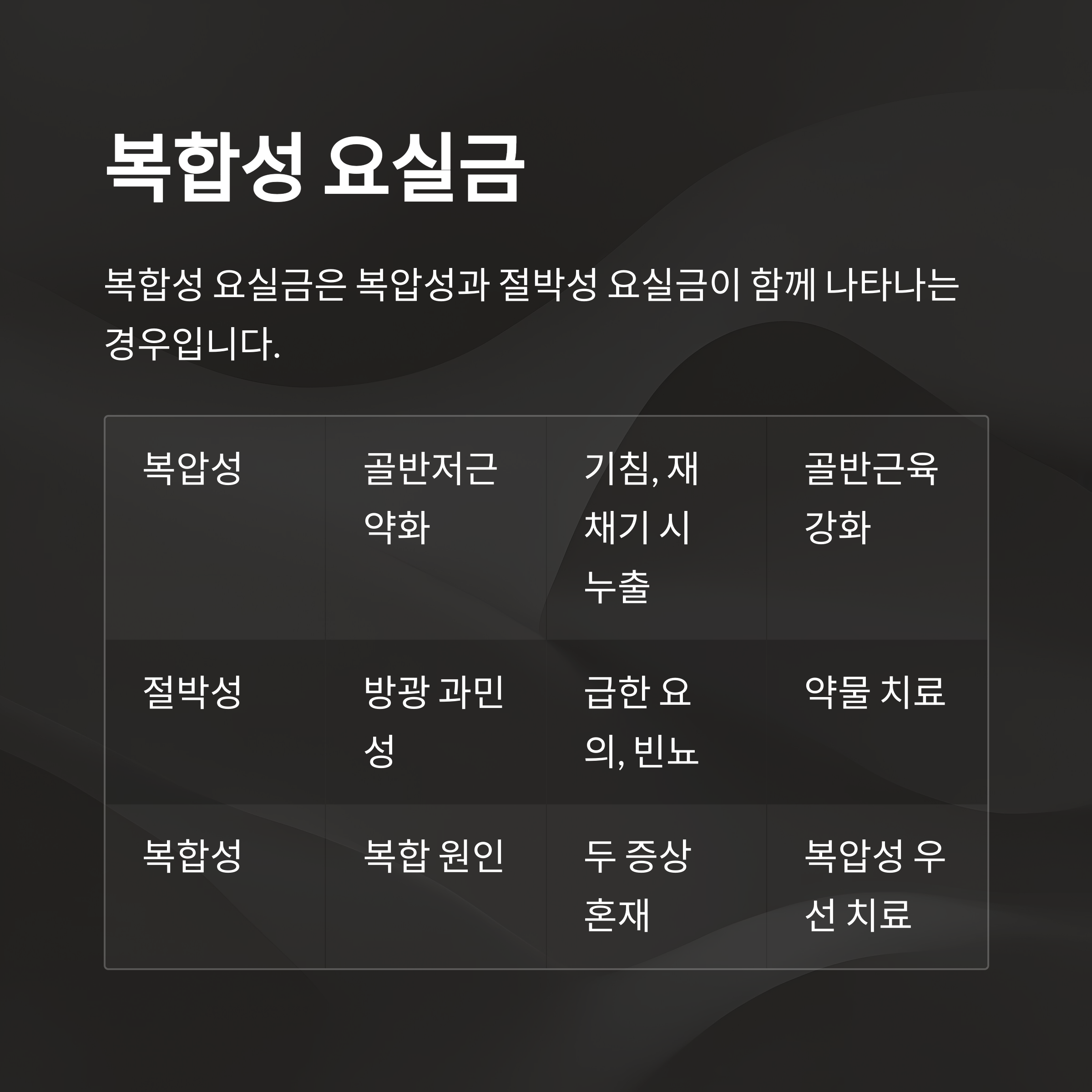 | 복합성 | 복합 원인 | 두 증상 혼재 | 복압성 우선 치료 |