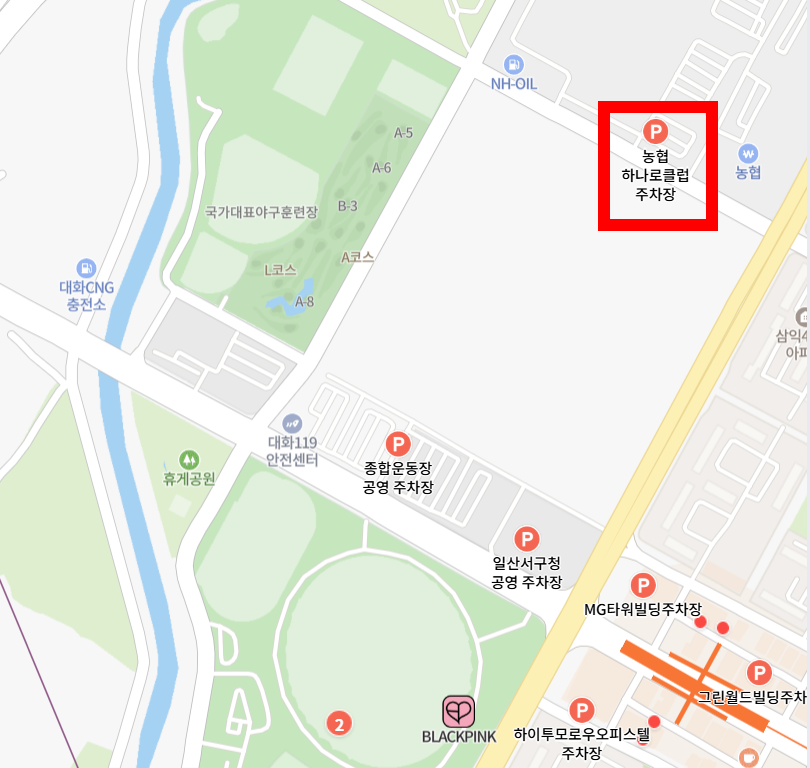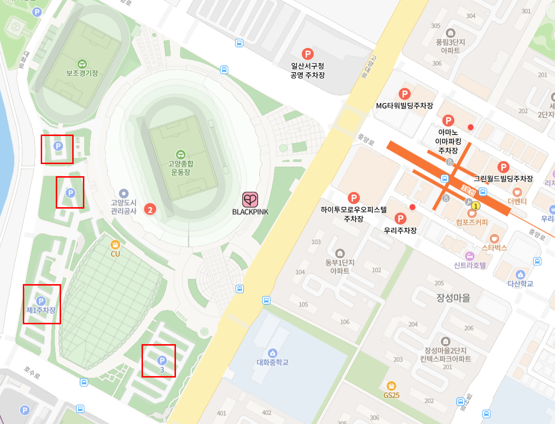 • 경기장과 가장 가까운 공영 주차장입니다.  편리하지만 콘서트 당일에는 빠르게 만차가 될 수 있고 출차시 시간이 오래 걸리는 단점 이 있습니다.