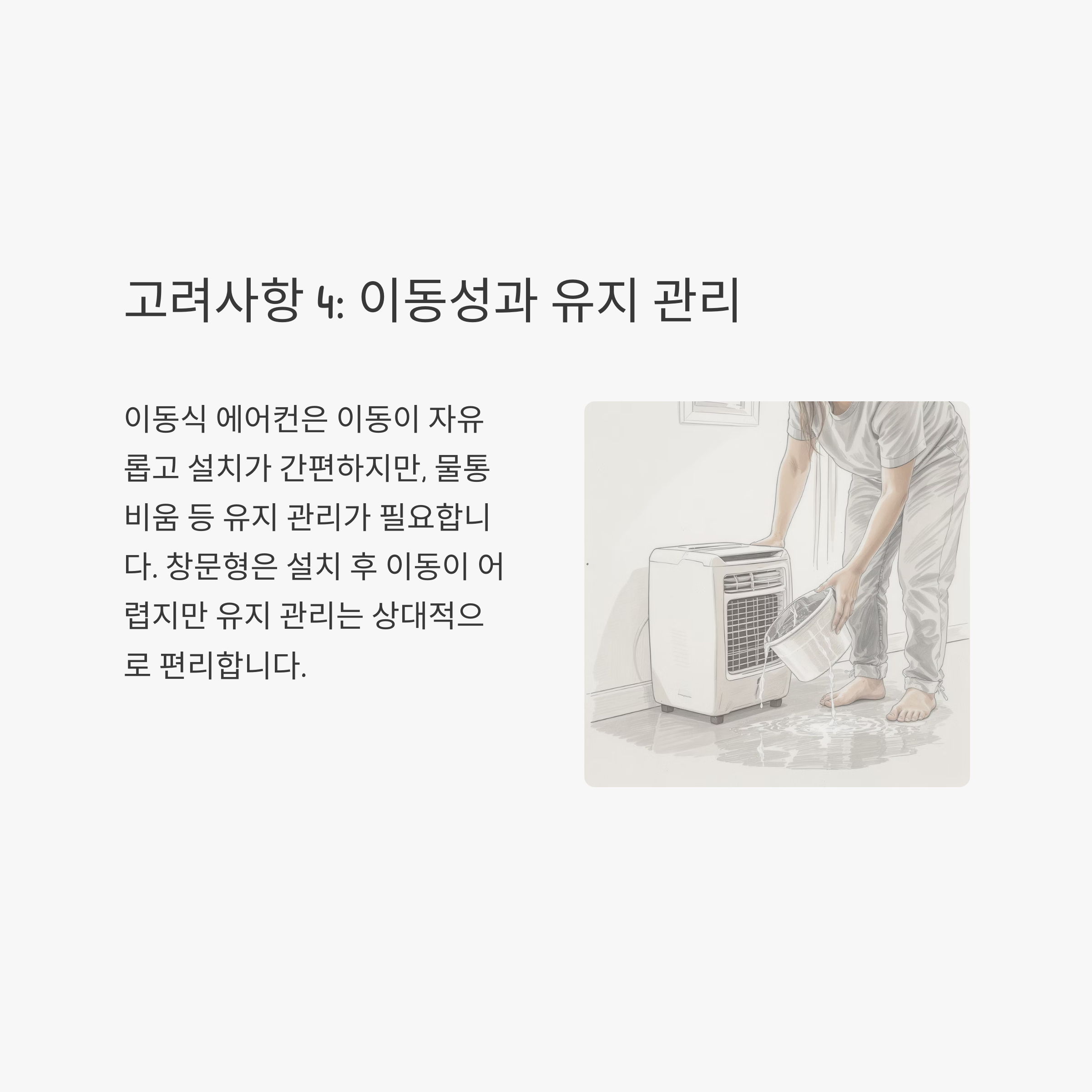 이동식 에어컨은 이동이 자유롭고 설치가 간편하지만, 물통 비움 등 유지 관리가 필요합니다. 창문형은 설치 후 이동이 어렵지만 유지 관리는 상대적으로 편리합니다.