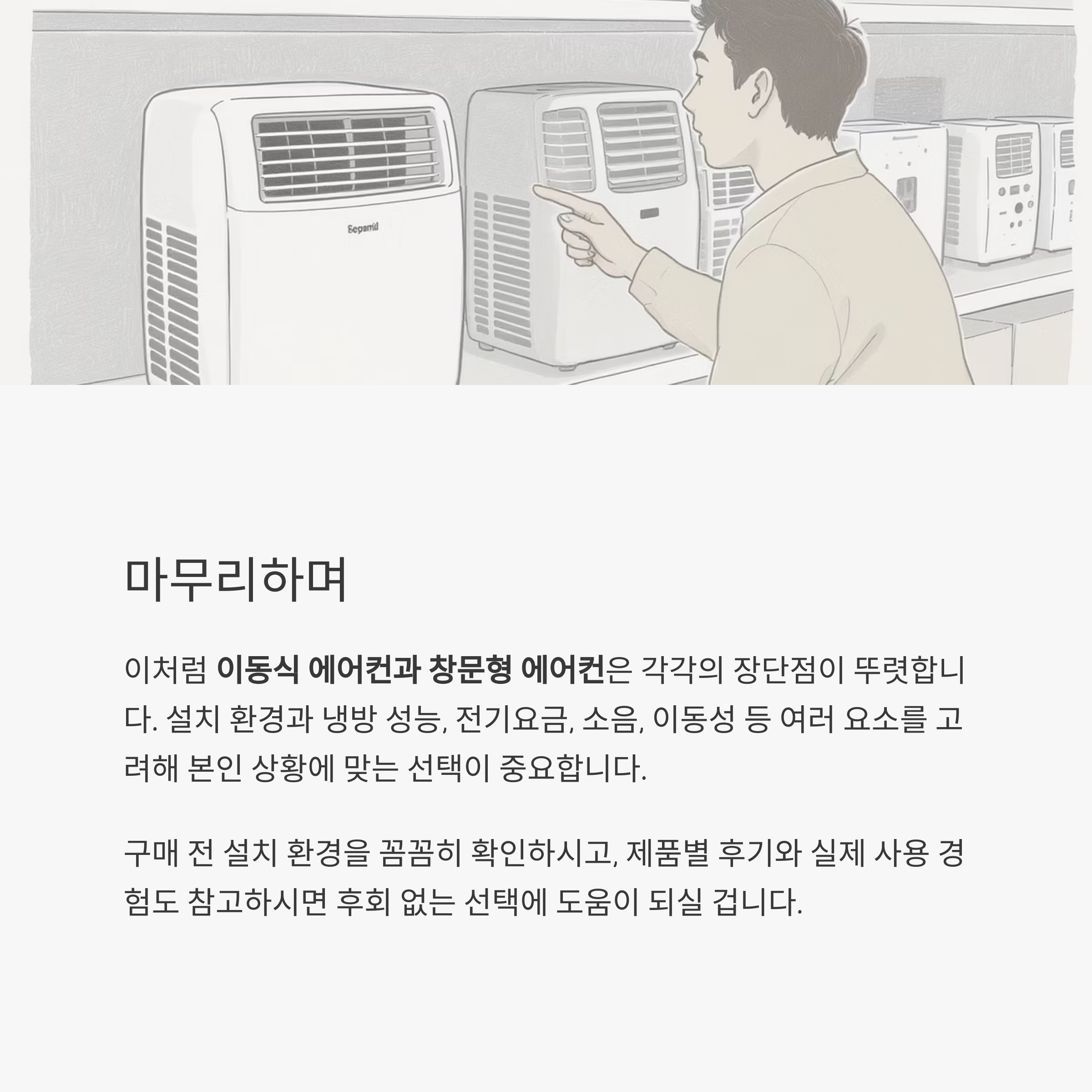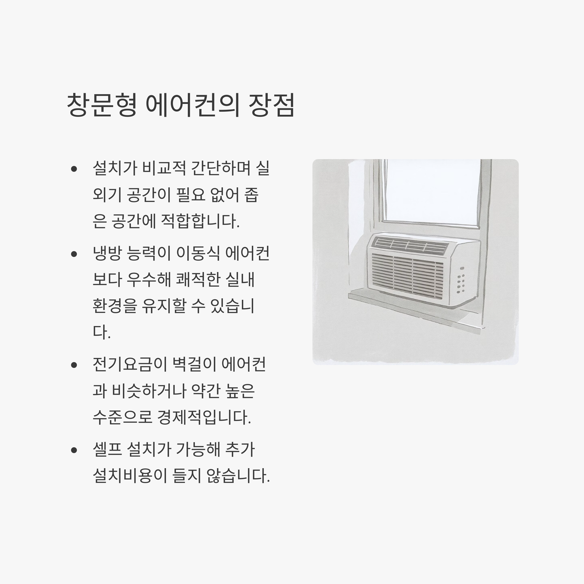 - 냉방 성능과 전기요금 절감, 소음 최소화를 원한다면 창문형 에어컨이 더 나은 선택입니다.