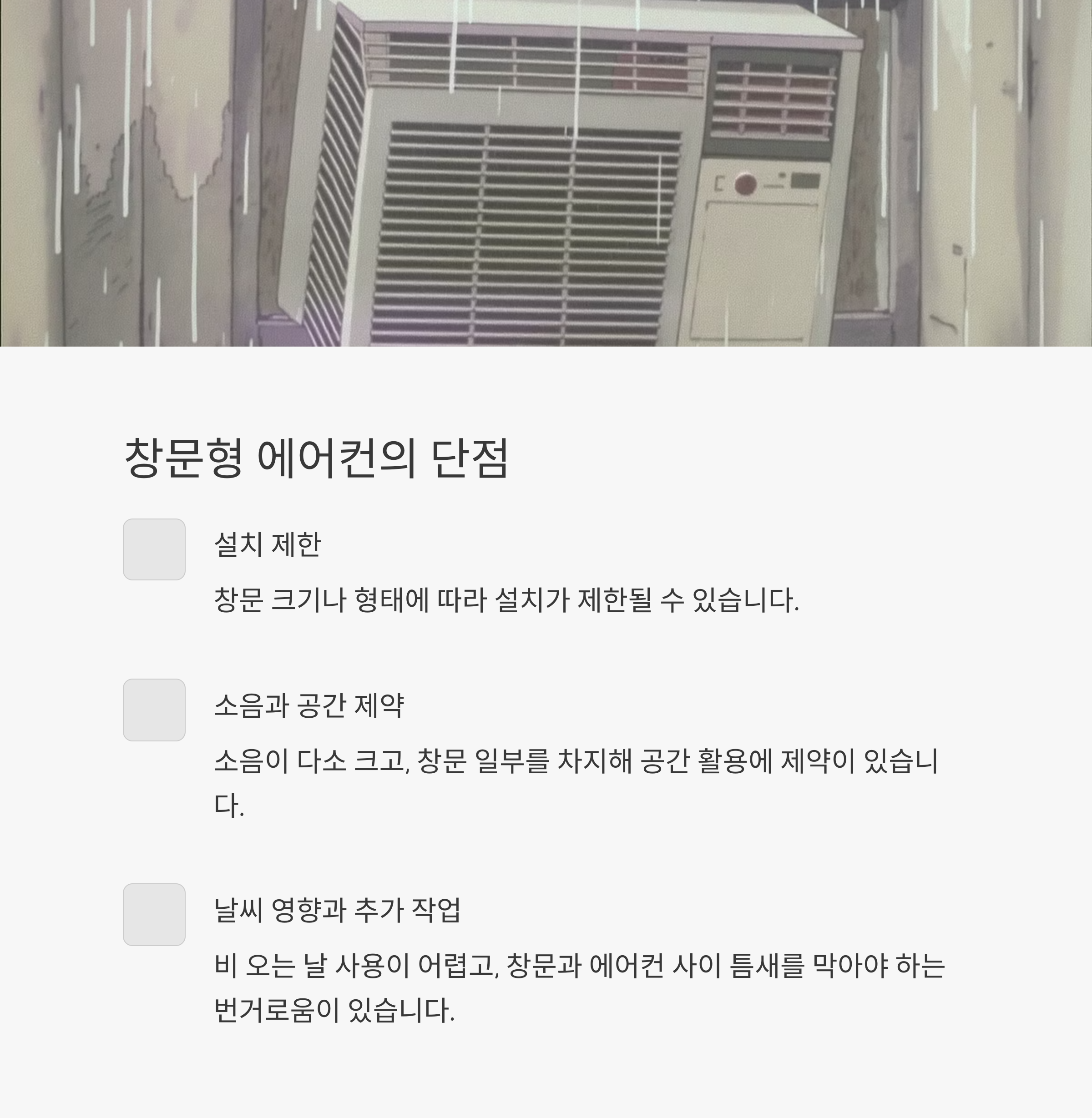 - 비 오는 날 사용이 어렵고, 창문과 에어컨 사이 틈새를 막아야 하는 번거로움이 있습니다.