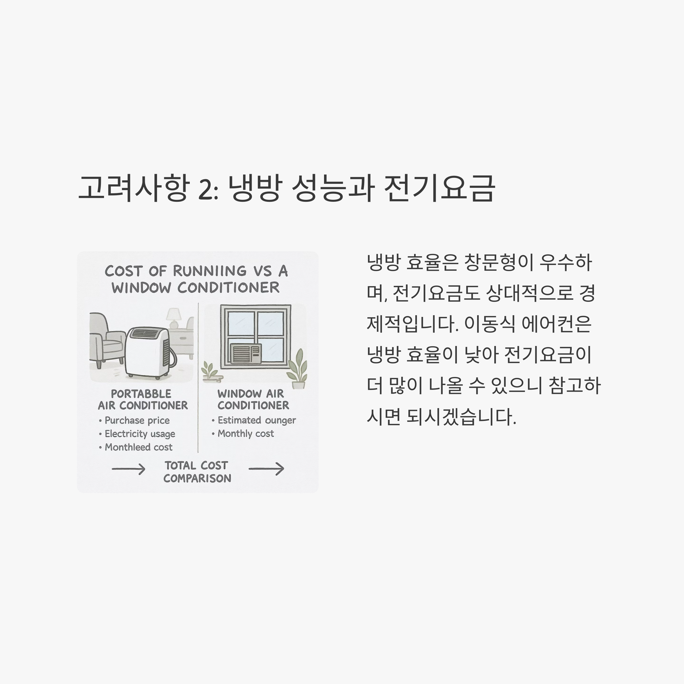 냉방 효율은 창문형이 우수하며, 전기요금도 상대적으로 경제적입니다. 이동식 에어컨은 냉방 효율이 낮아 전기요금이 더 많이 나올 수 있으니 참고하시면 되시겠습니다. - 소음과 생활 환경