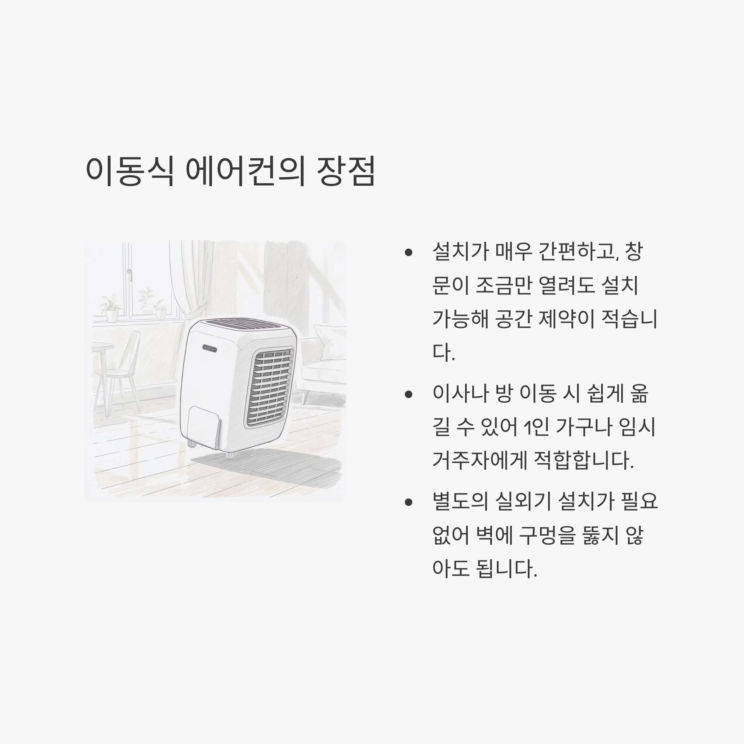 - 좁은 공간에서 간편한 설치와 이동성을 원한다면 이동식 에어컨이 적합합니다.