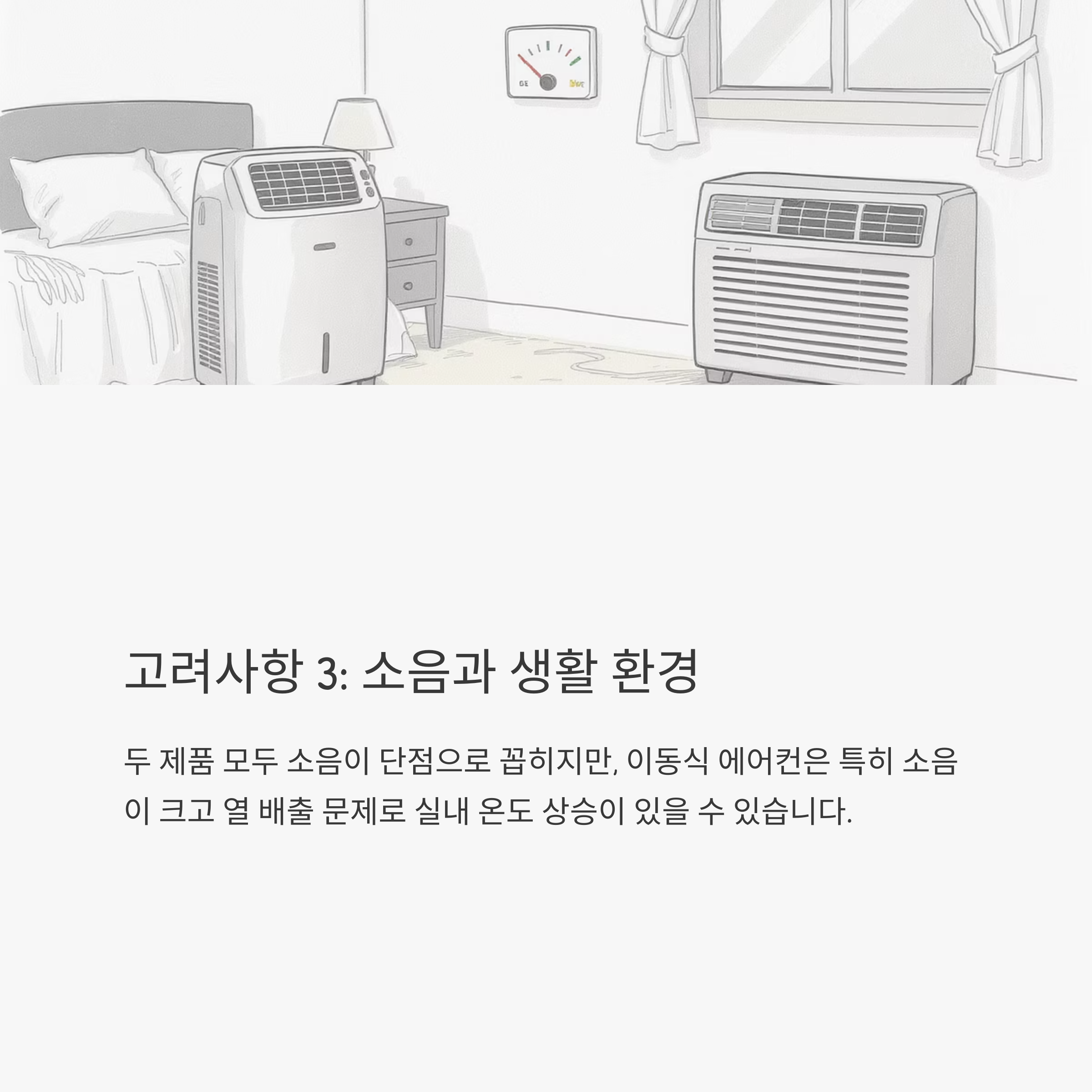 두 제품 모두 소음이 단점으로 꼽히지만, 이동식 에어컨은 특히 소음이 크고 열 배출 문제로 실내 온도 상승이 있을 수 있습니다. - 이동성과 유지 관리