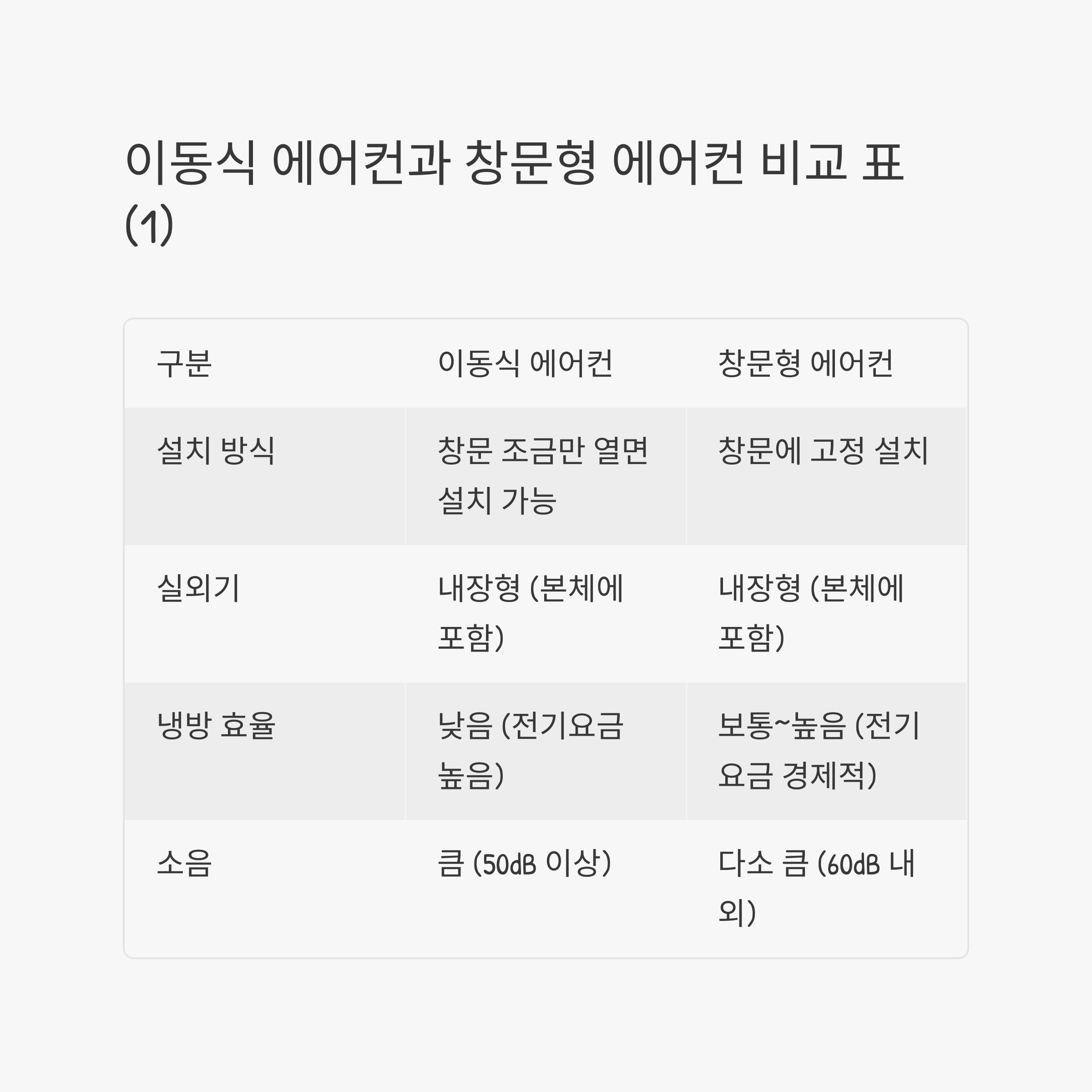 이처럼 이동식 에어컨과 창문형 에어컨은 각각의 장단점이 뚜렷합니다. 설치 환경과 냉방 성능, 전기요금, 소음, 이동성 등 여러 요소를 고려해 본인 상황에 맞는 선택이 중요합니다.