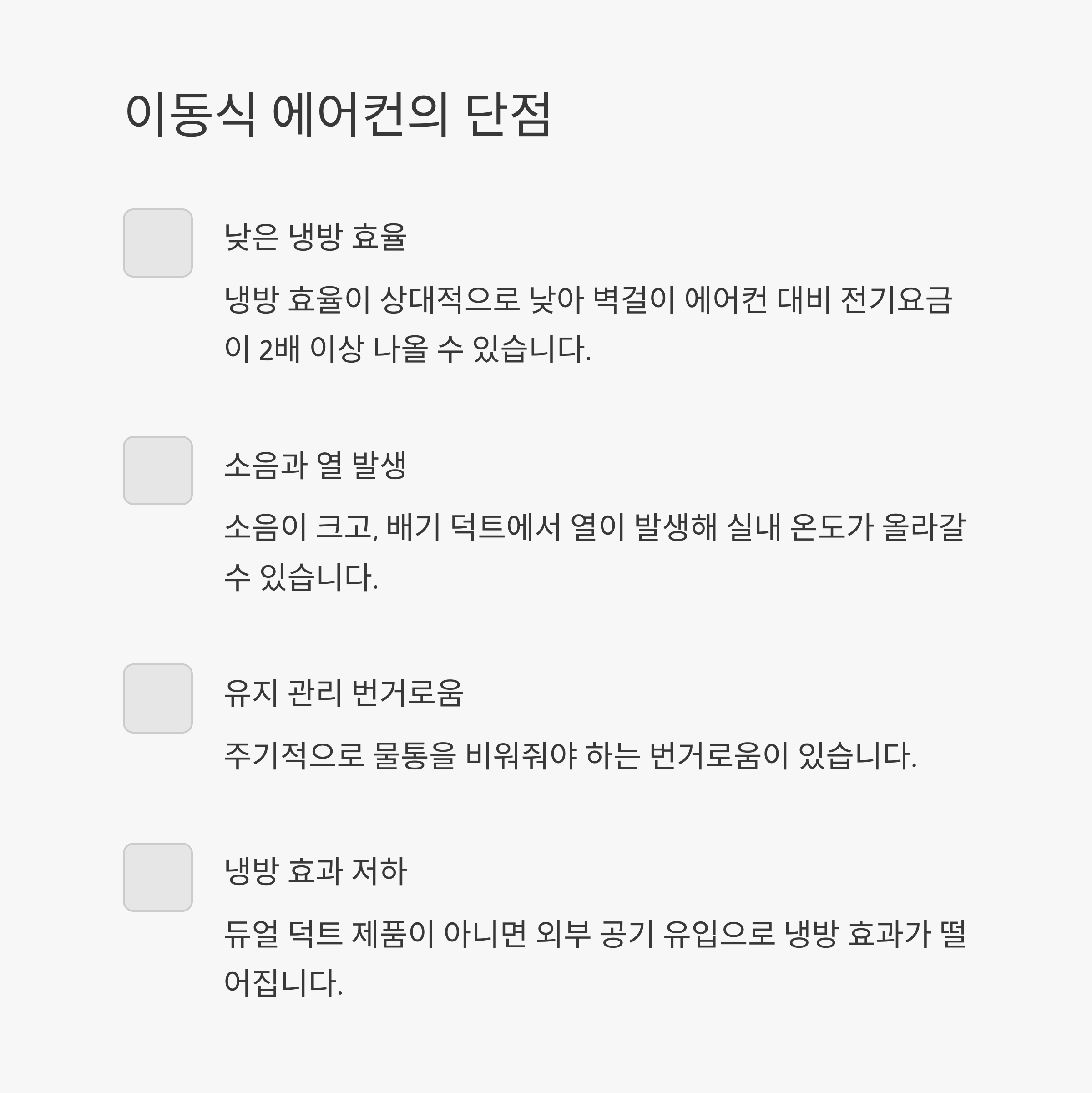 - 냉방 효율이 상대적으로 낮아 벽걸이 에어컨 대비 전기요금이 2배 이상 나올 수 있습니다.