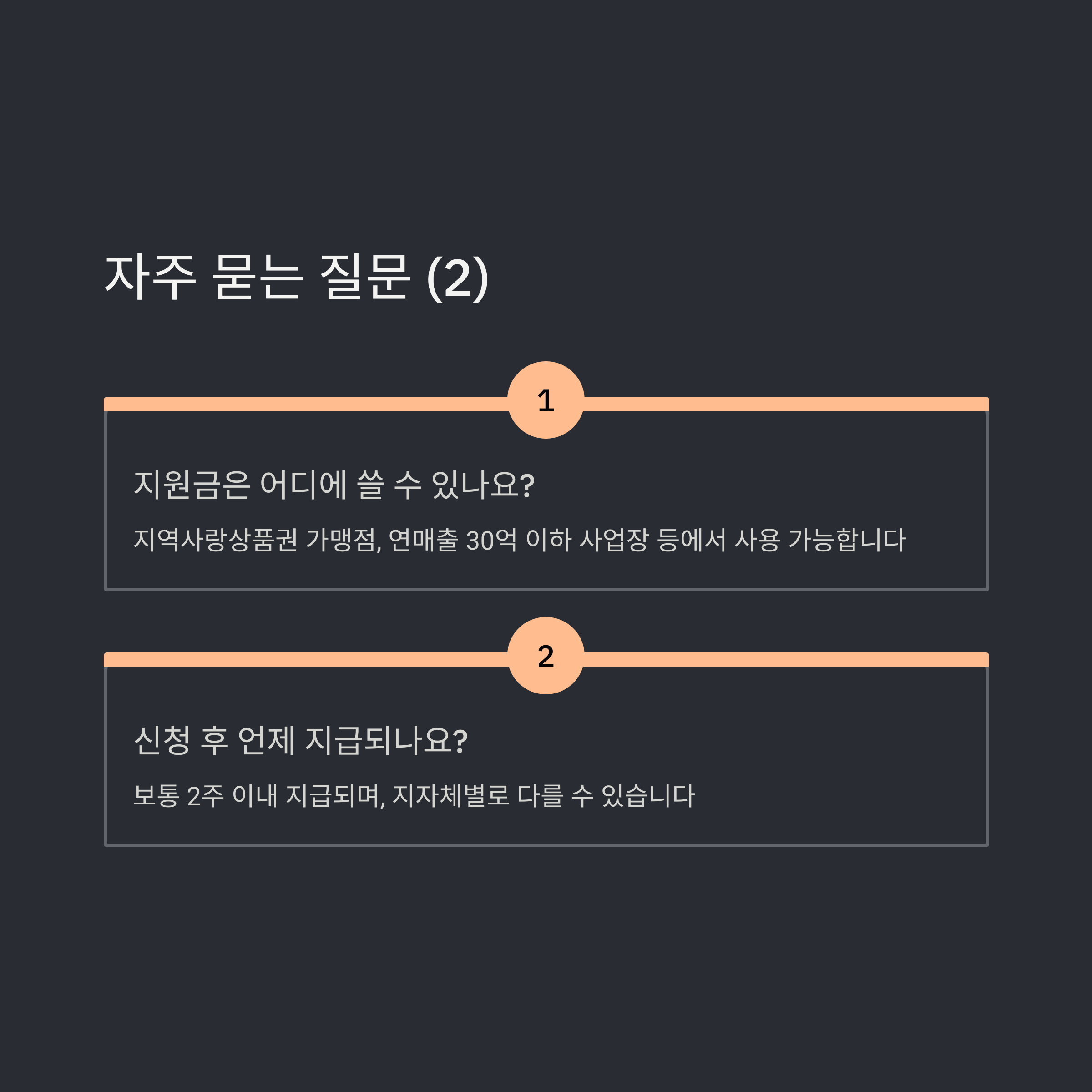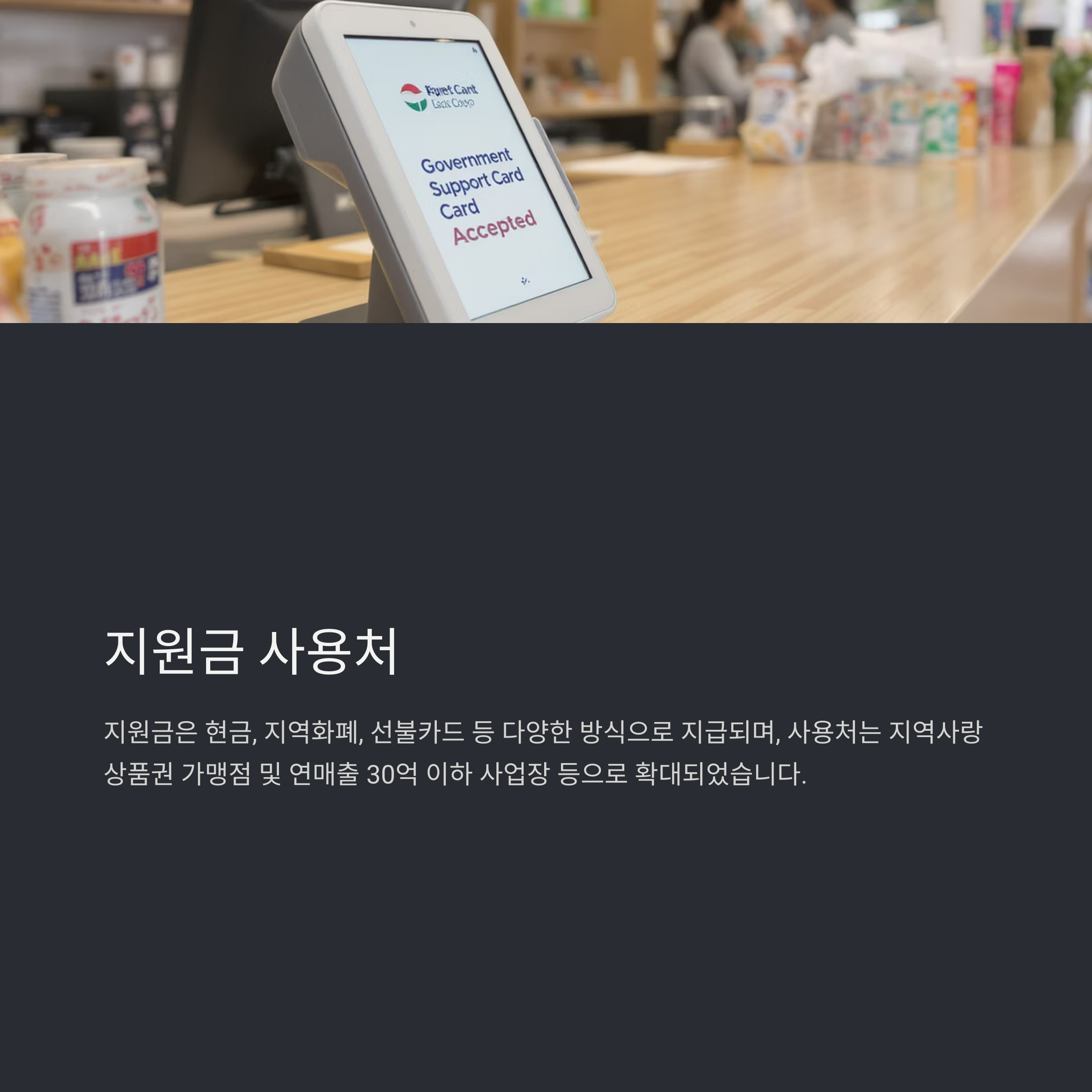 지원금은 현금, 지역화폐, 선불카드 등 다양한 방식으로 지급되며, 사용처는 지역사랑상품권 가맹점 및 연매출 30억 이하 사업장 등으로 확대되었습니다