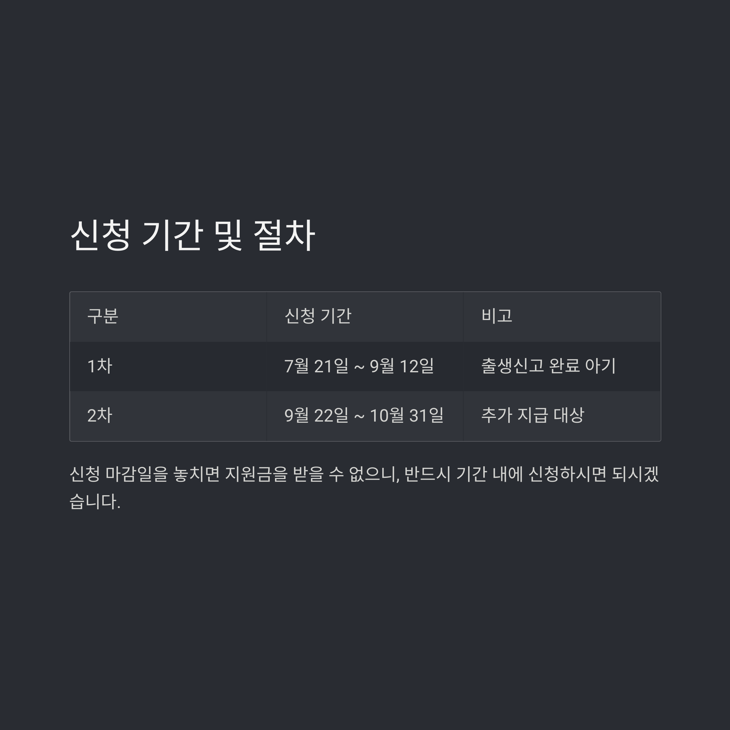 신청 마감일을 놓치면 지원금을 받을 수 없으니, 반드시 기간 내에 신청하시면 되시겠습니다
