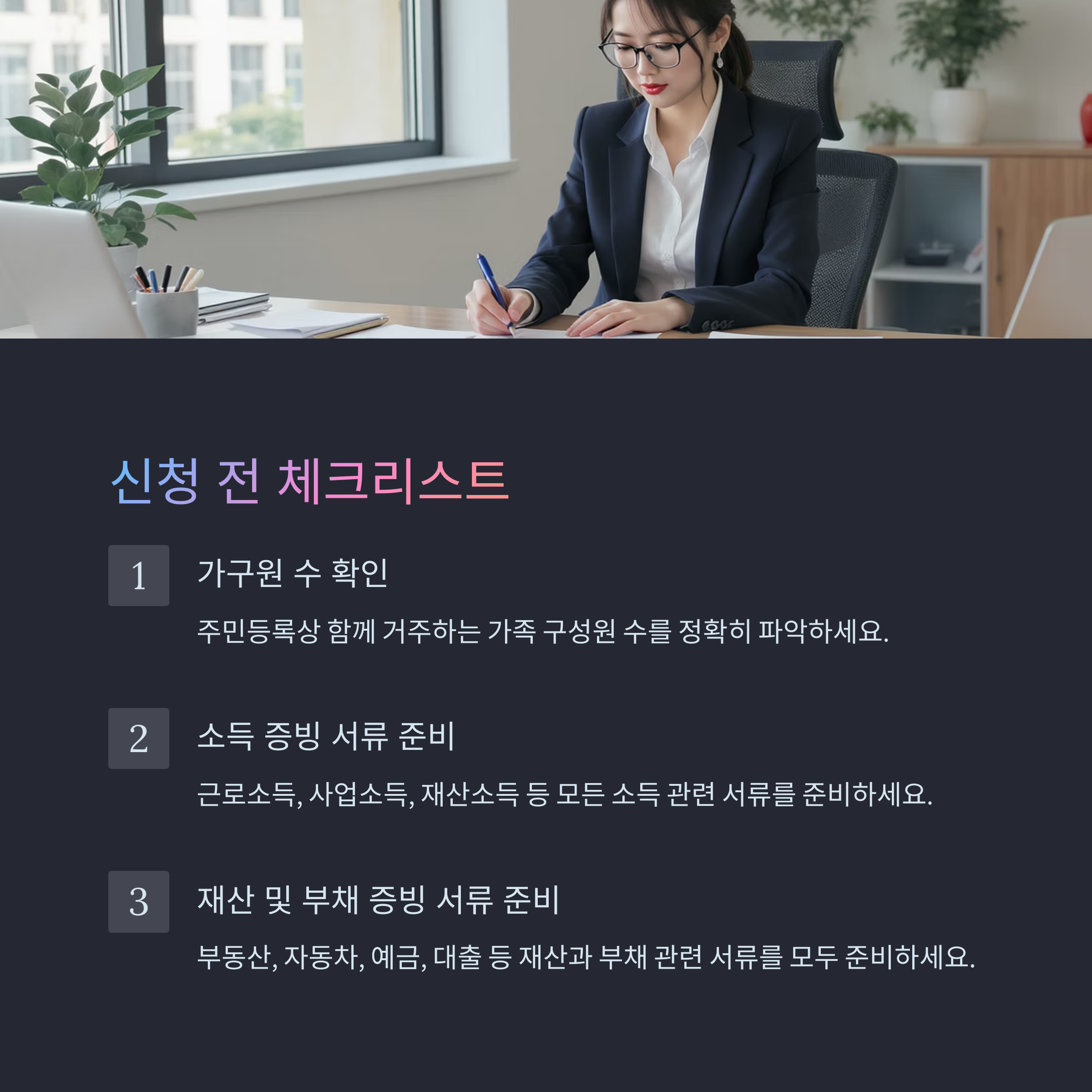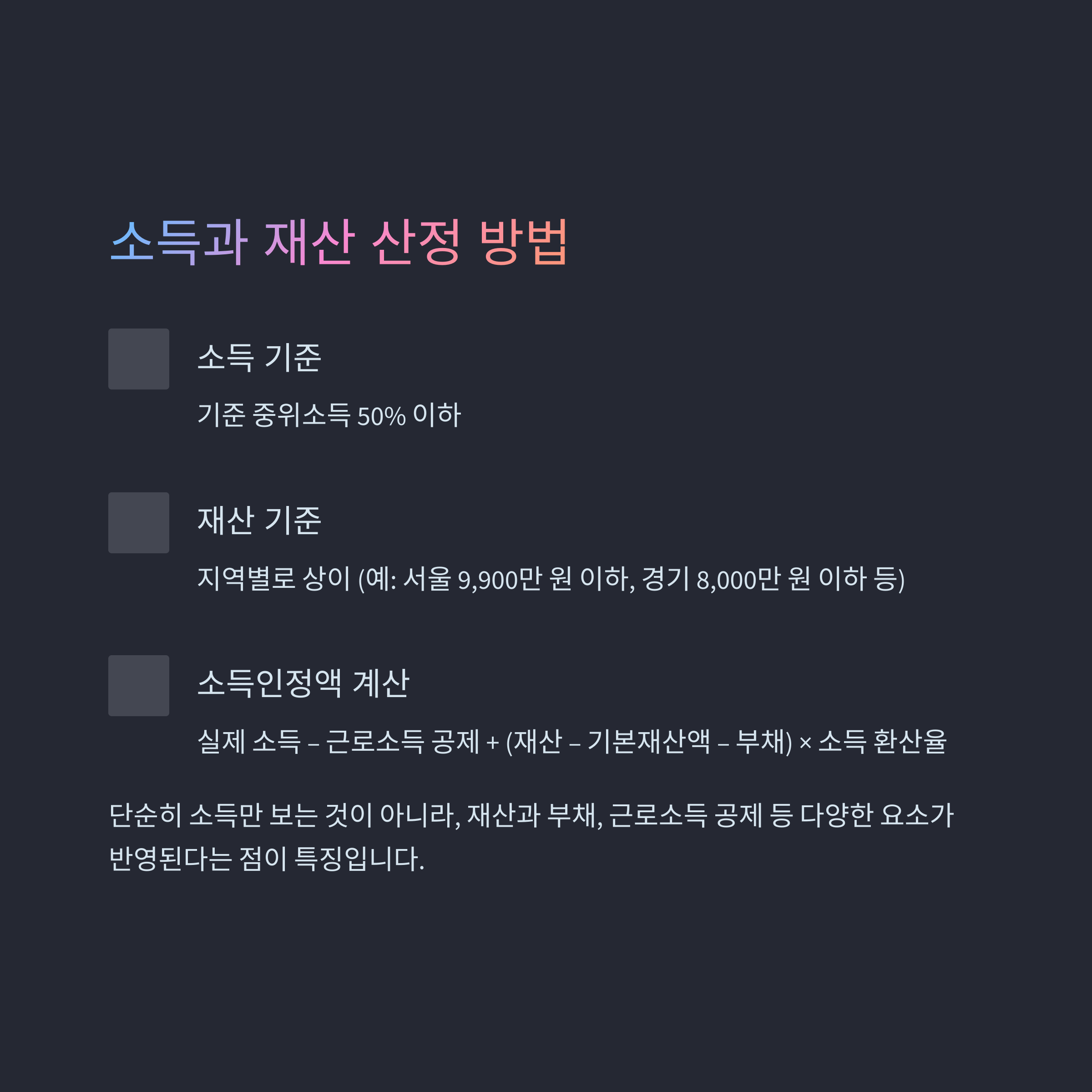 - 재산 기준: 지역별로 상이 (예: 서울 9,900만 원 이하, 경기 8,000만 원 이하 등)