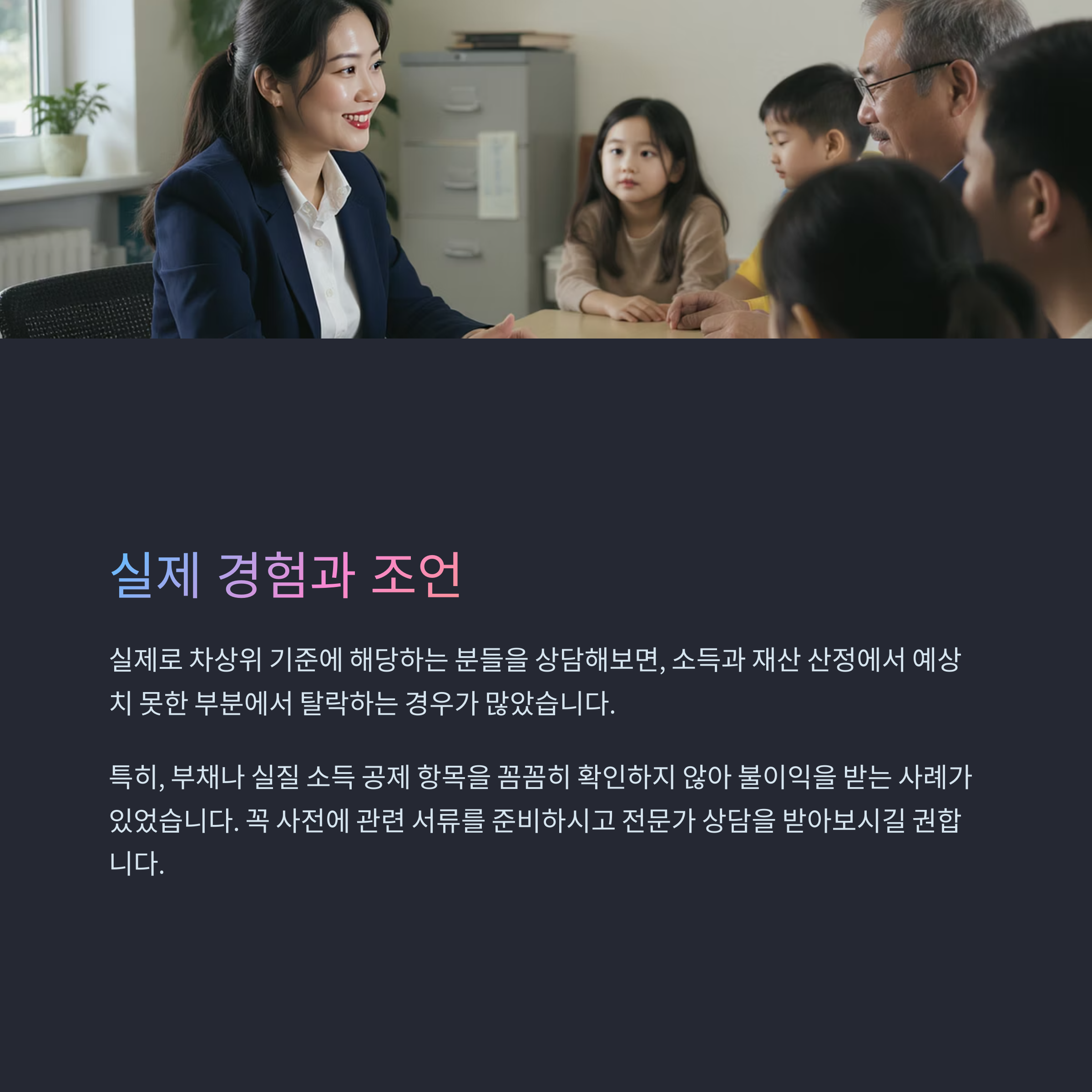 실제로 차상위 기준에 해당하는 분들을 상담해보면, 소득과 재산 산정에서 예상치 못한 부분에서 탈락하는 경우가 많았습니다. 특히, 부채나 실질 소득 공제 항목을 꼼꼼히 확인하지 않아 불이익을 받는 사례가 있었으니, 꼭 사전에 관련 서류를 준비하시고 전문가 상담을 받아보시길 권합니다.