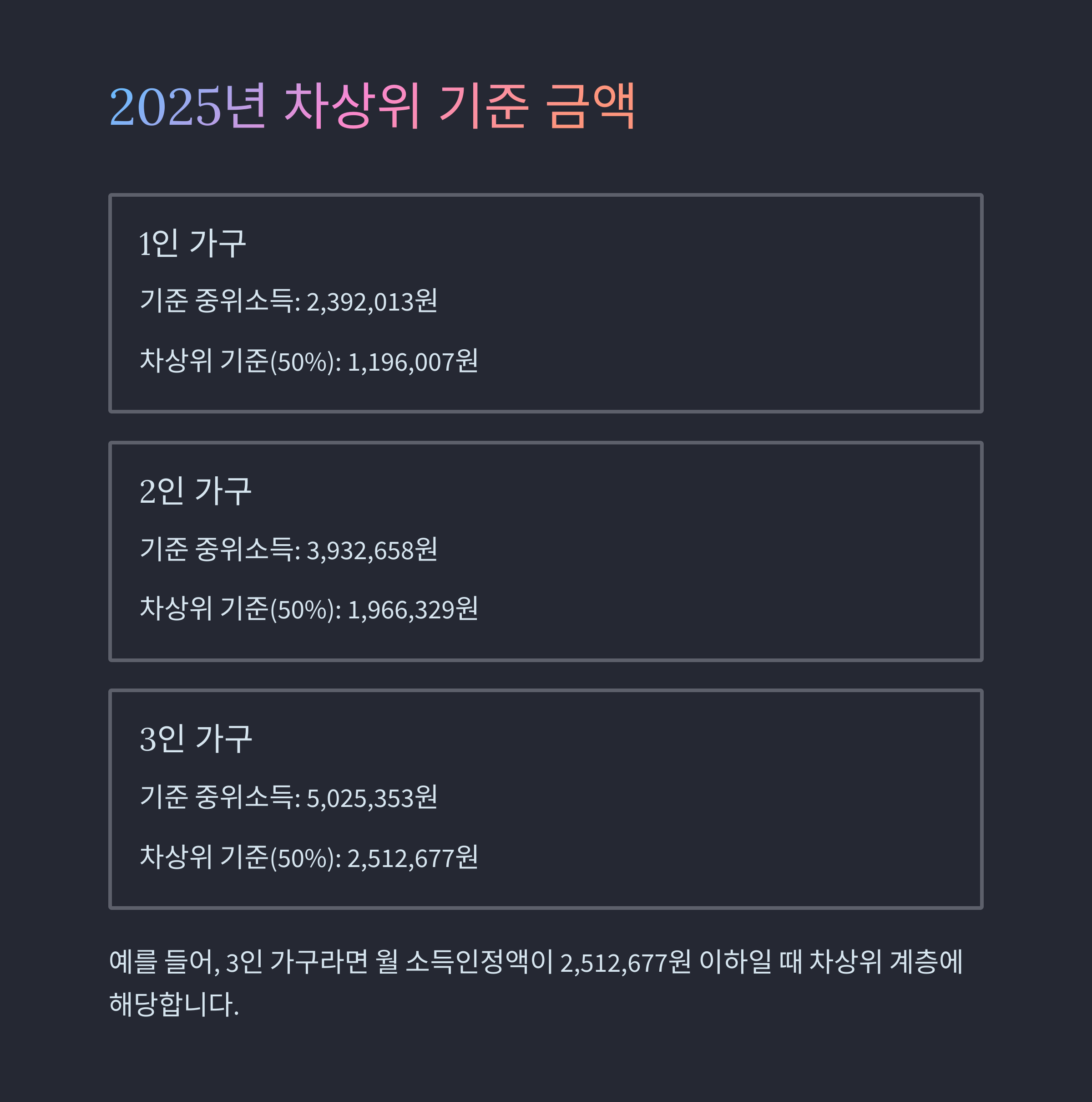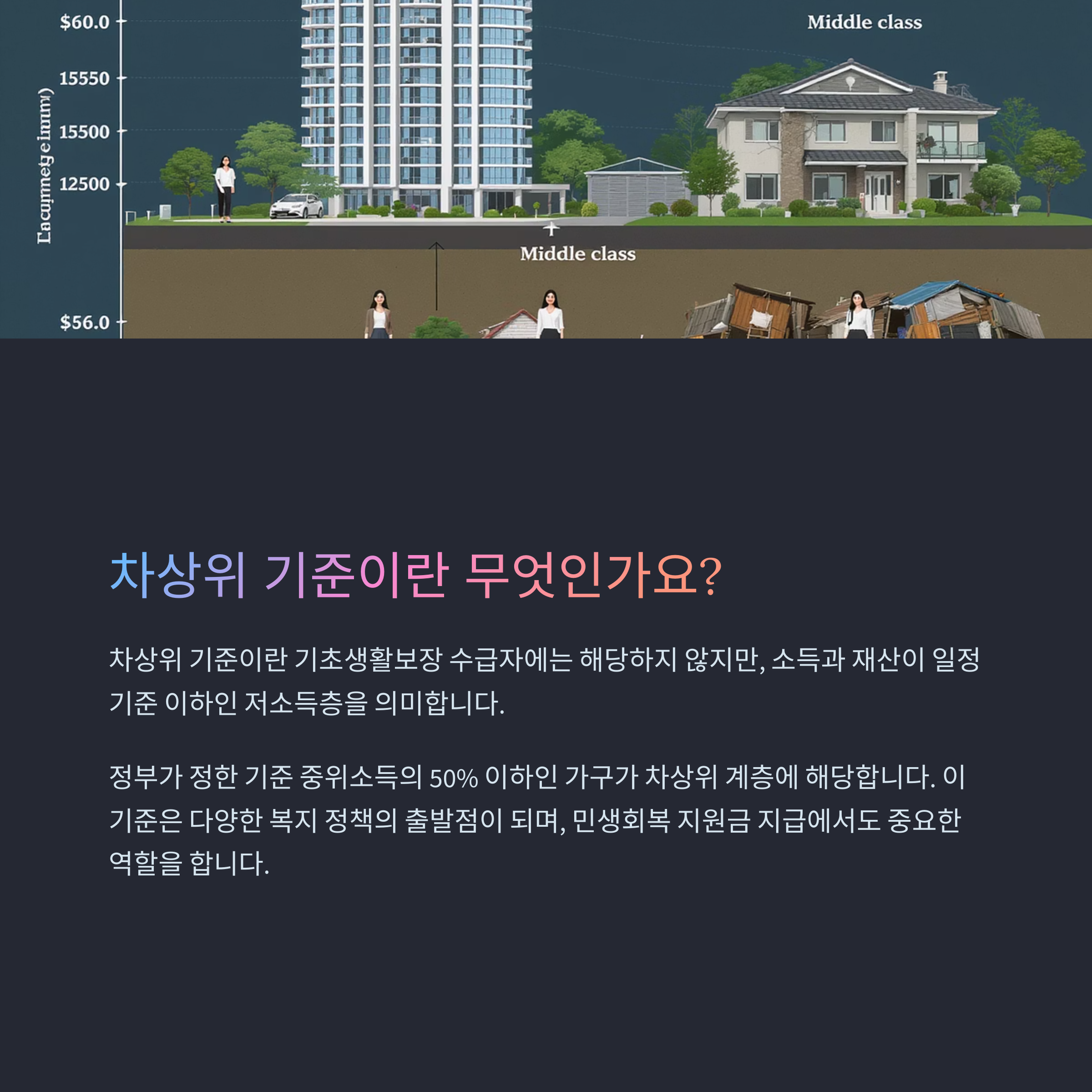 차상위 기준이란, 기초생활보장 수급자에는 해당하지 않지만, 소득과 재산이 일정 기준 이하인 저소득층을 의미합니다. 다시 말해, 정부가 정한 기준 중위소득의 50% 이하인 가구가 차상위 계층에 해당하게 됩니다. 이처럼 차상위 기준은 다양한 복지 정책의 출발점이 되며, 민생회복 지원금 지급에서도 중요한 역할을 합니다.