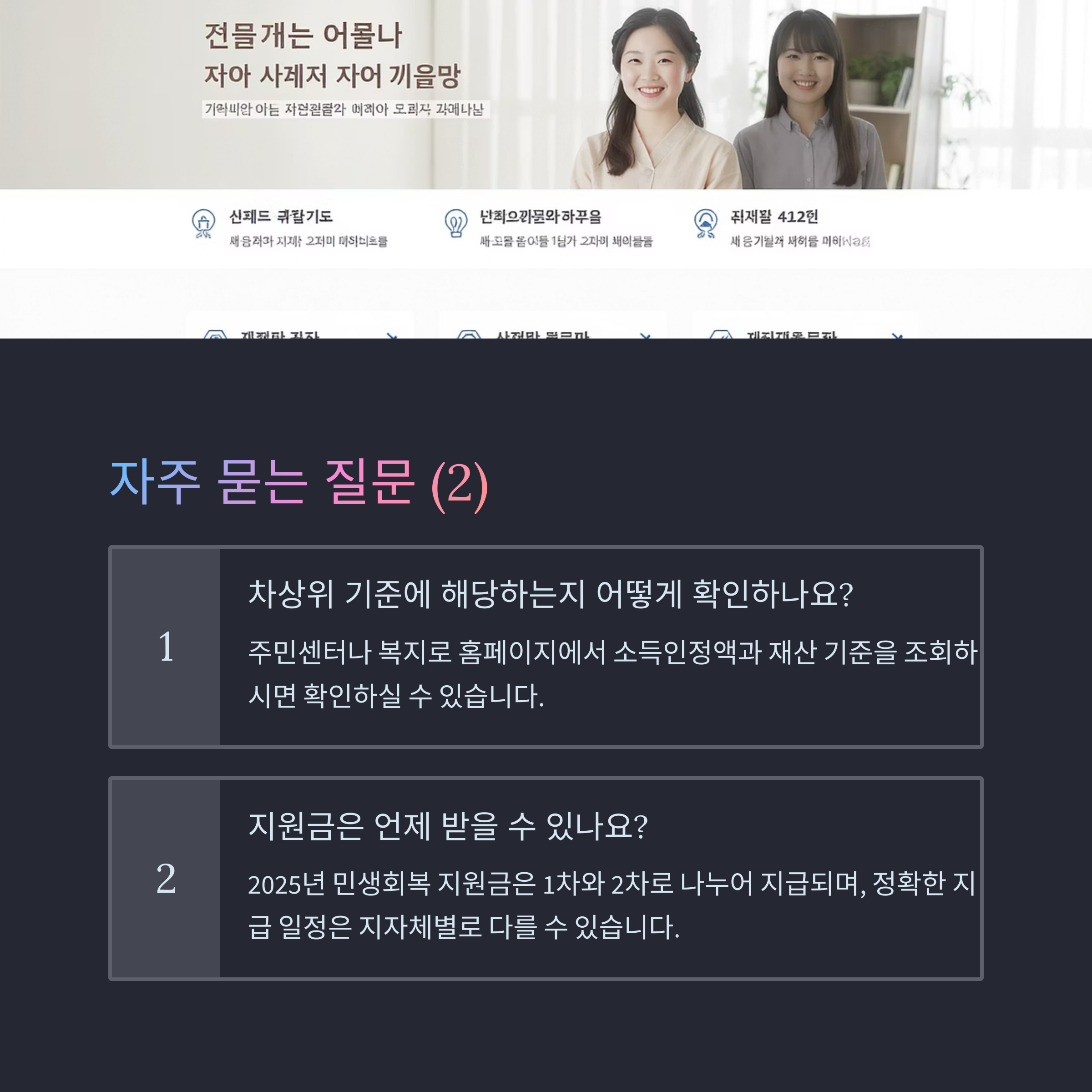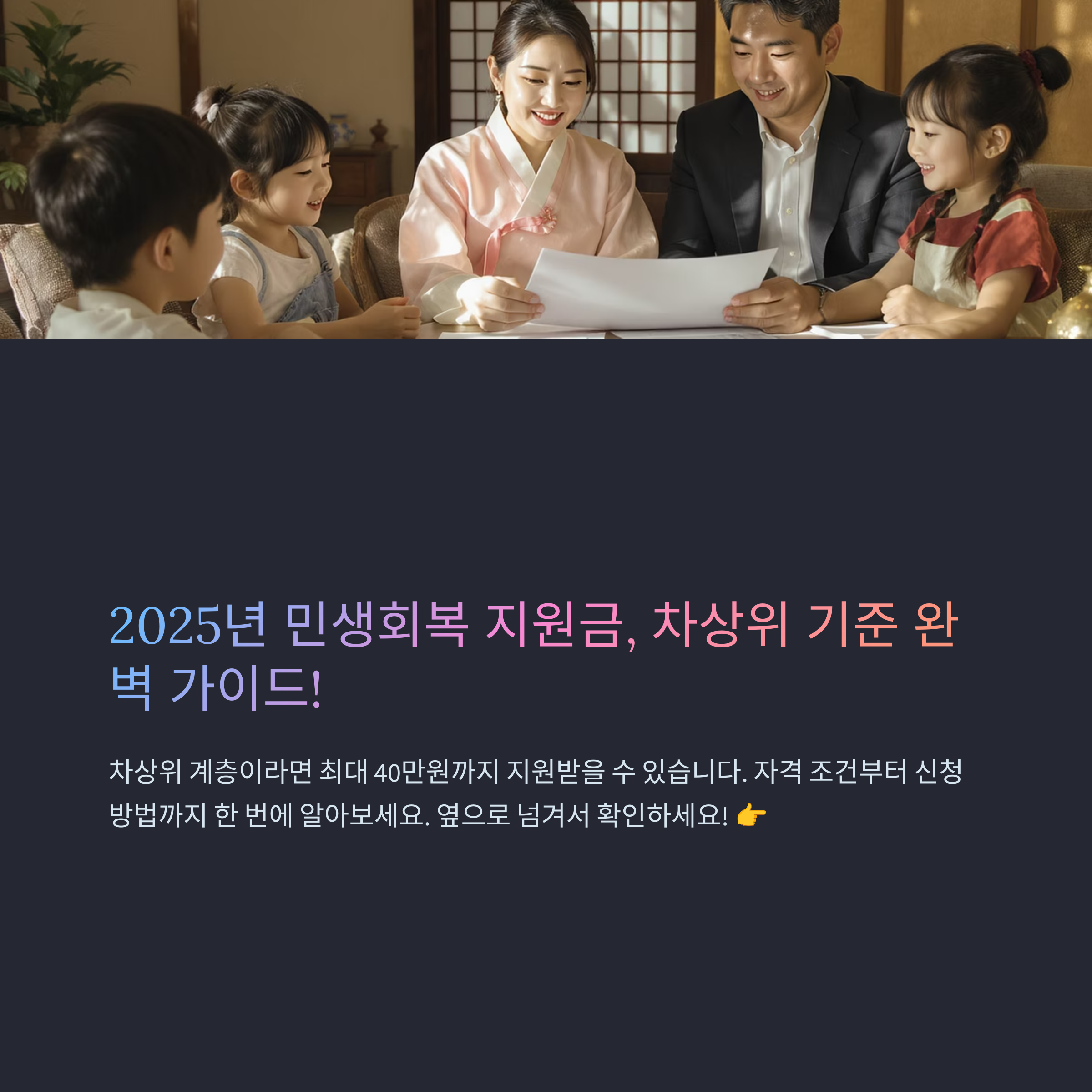차상위 기준은 단순한 숫자가 아니라, 실제 생활과 밀접하게 연결된 중요한 기준입니다. 2025년 민생회복 지원금도 차상위 기준을 바탕으로 지급되기 때문에, 본인의 자격을 꼼꼼히 확인하시면 되시겠습니다. 이처럼 차상위 기준과 지원금 제도를 잘 활용하셔서, 조금이라도 더 안정적인 생활을 누리시길 바랍니다.