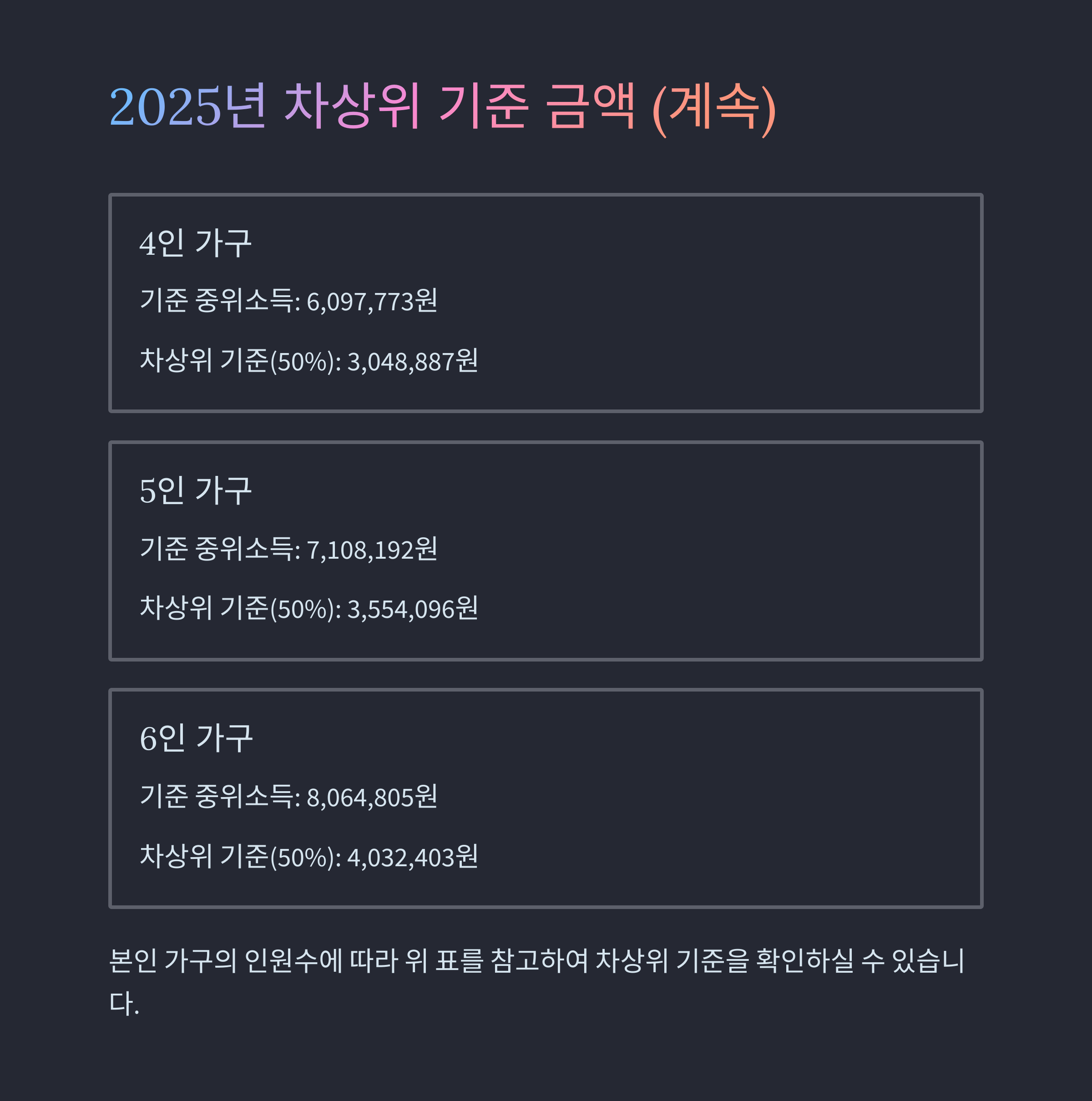 | 가구원수 | 기준 중위소득(원) | 차상위 기준(50% 이하, 원) |