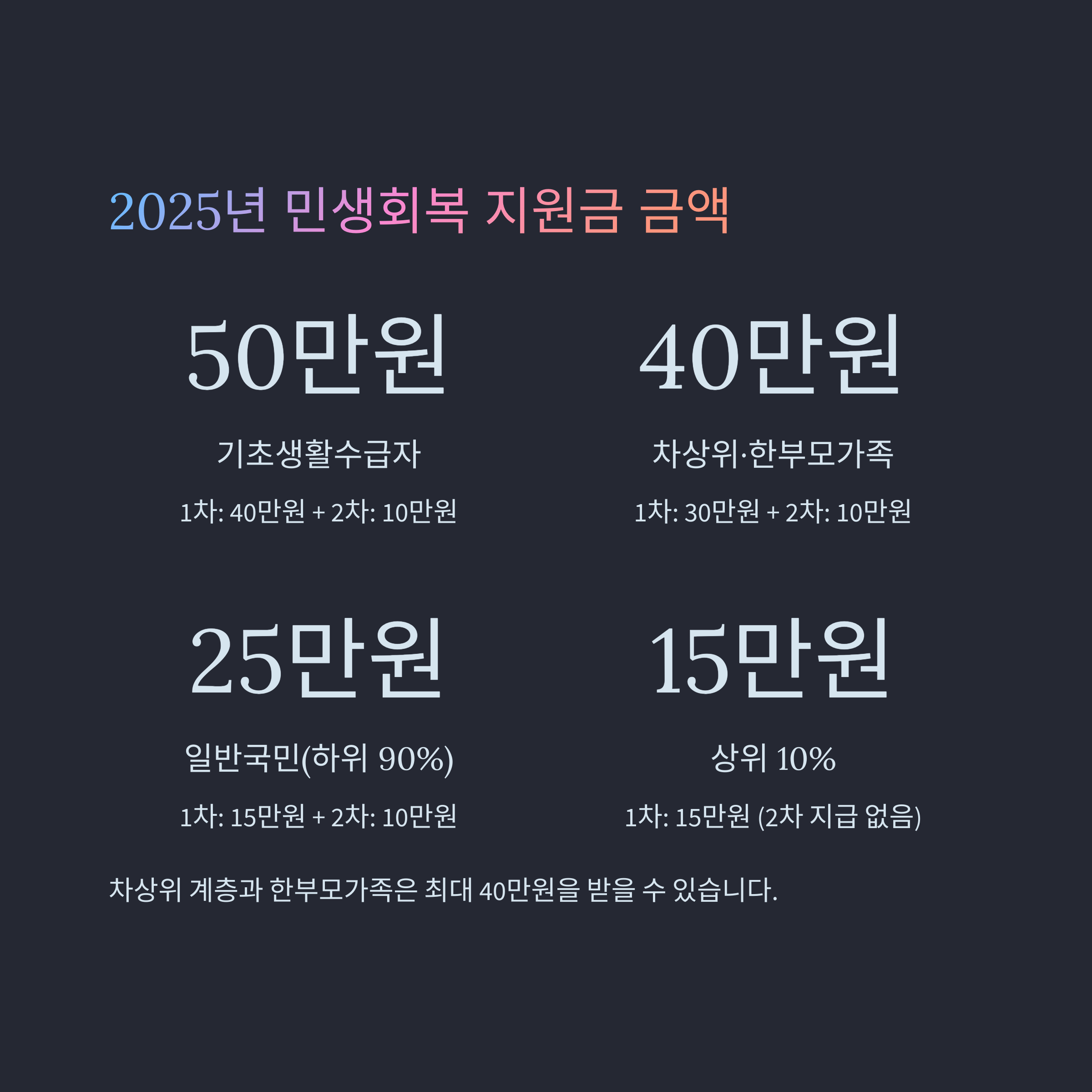 차상위 기준과 2025년 민생회복 지원금 자격, 지원금액, 신청 방법까지 한 번에 확인하세요. 실제 통계와 최신 기준으로 꼼꼼하게 안내드립니다. 지금 바로 확인해보세요!