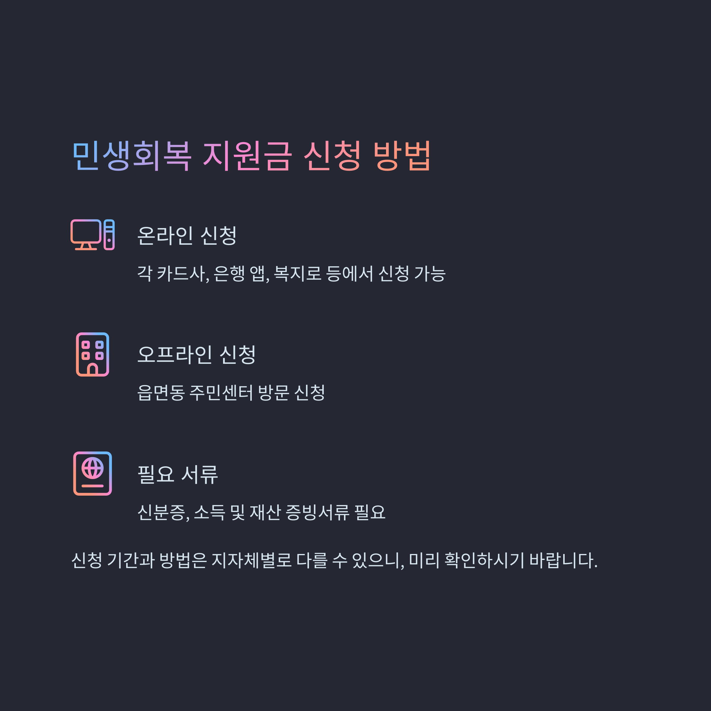 - 온라인: 각 카드사, 은행 앱, 복지로 등에서 신청 가능
