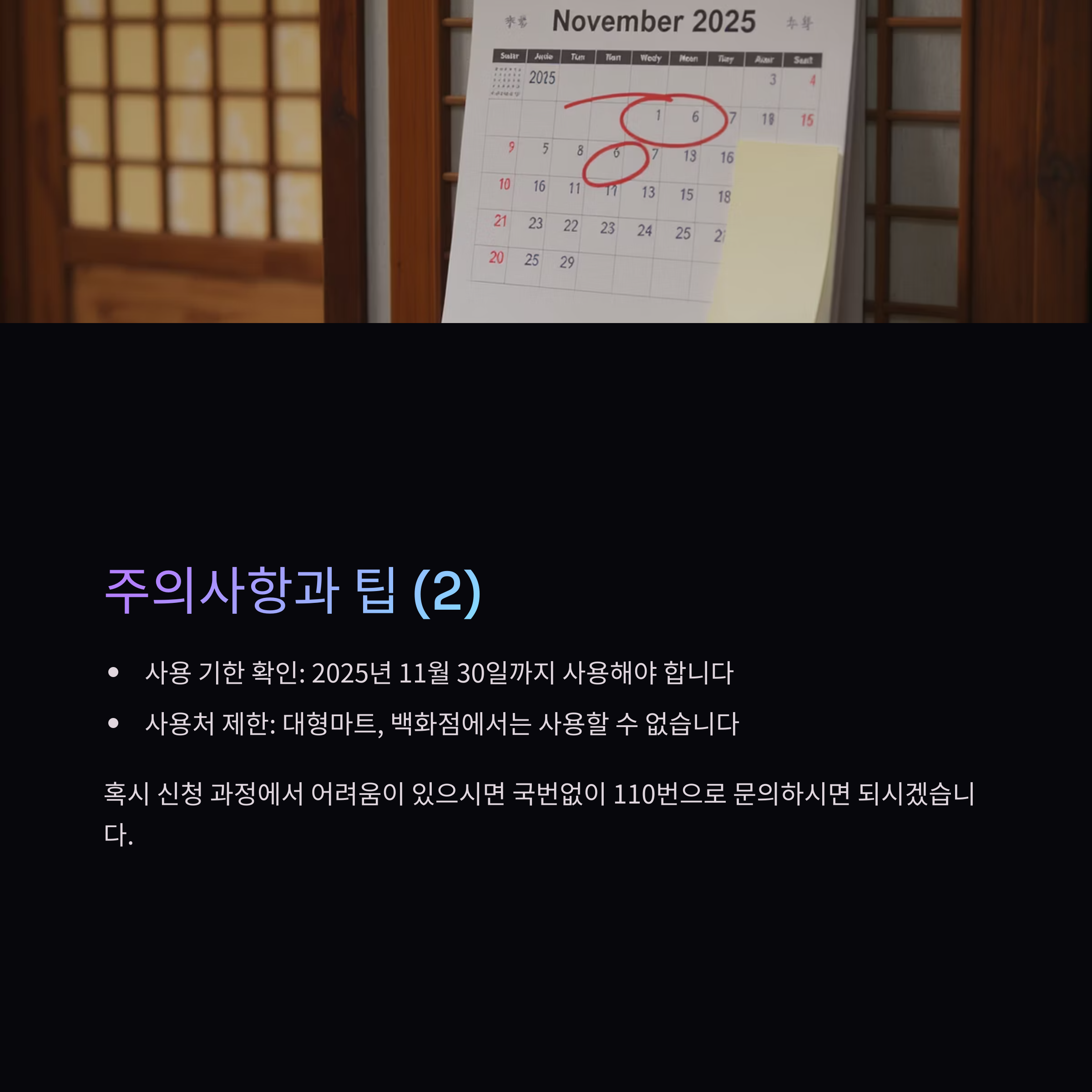 - 사용처 제한: 대형마트, 백화점에서는 사용할 수 없습니다