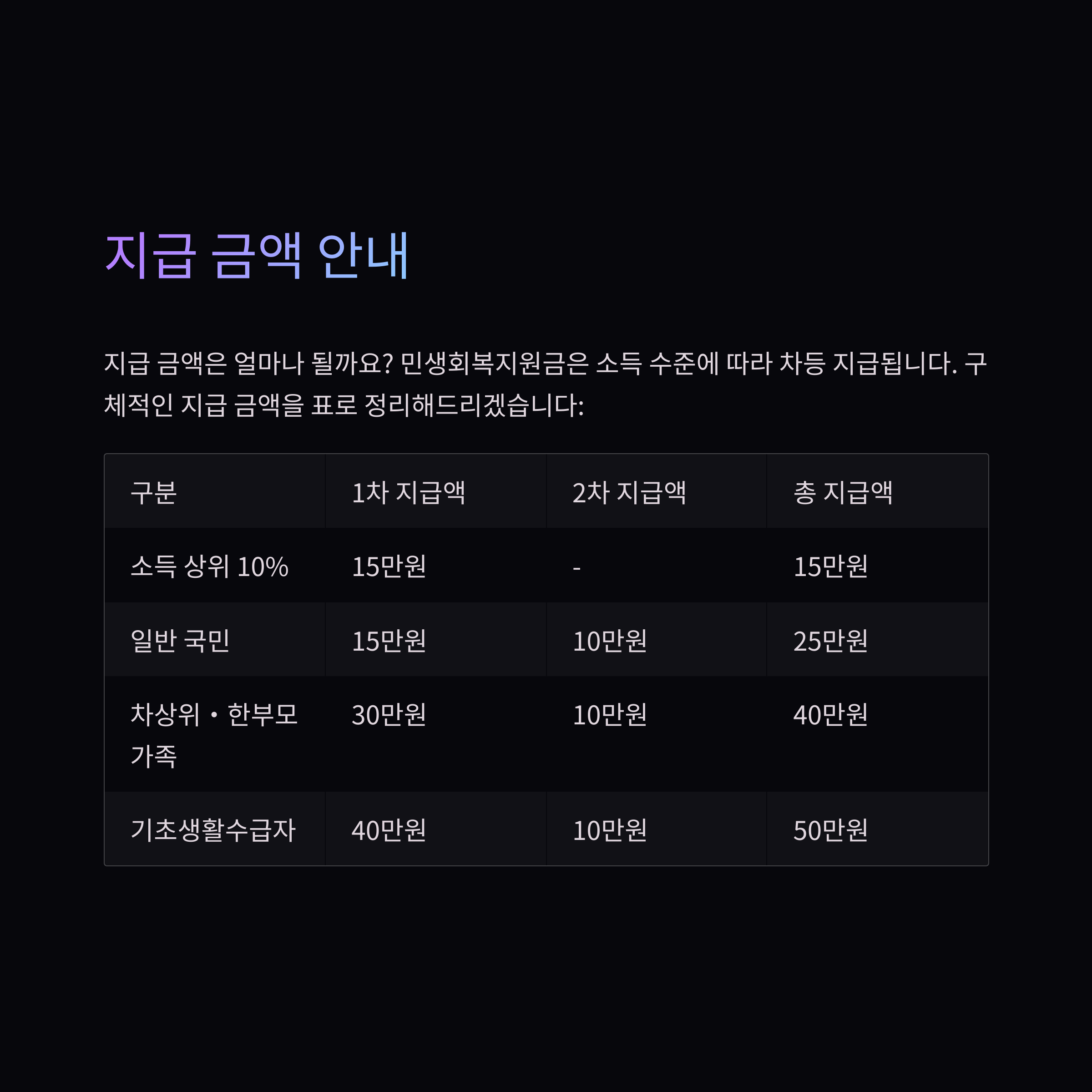 민생회복지원금은 소득 수준에 따라 차등 지급됩니다. 구체적인 지급 금액을 표로 정리해드리겠습니다: