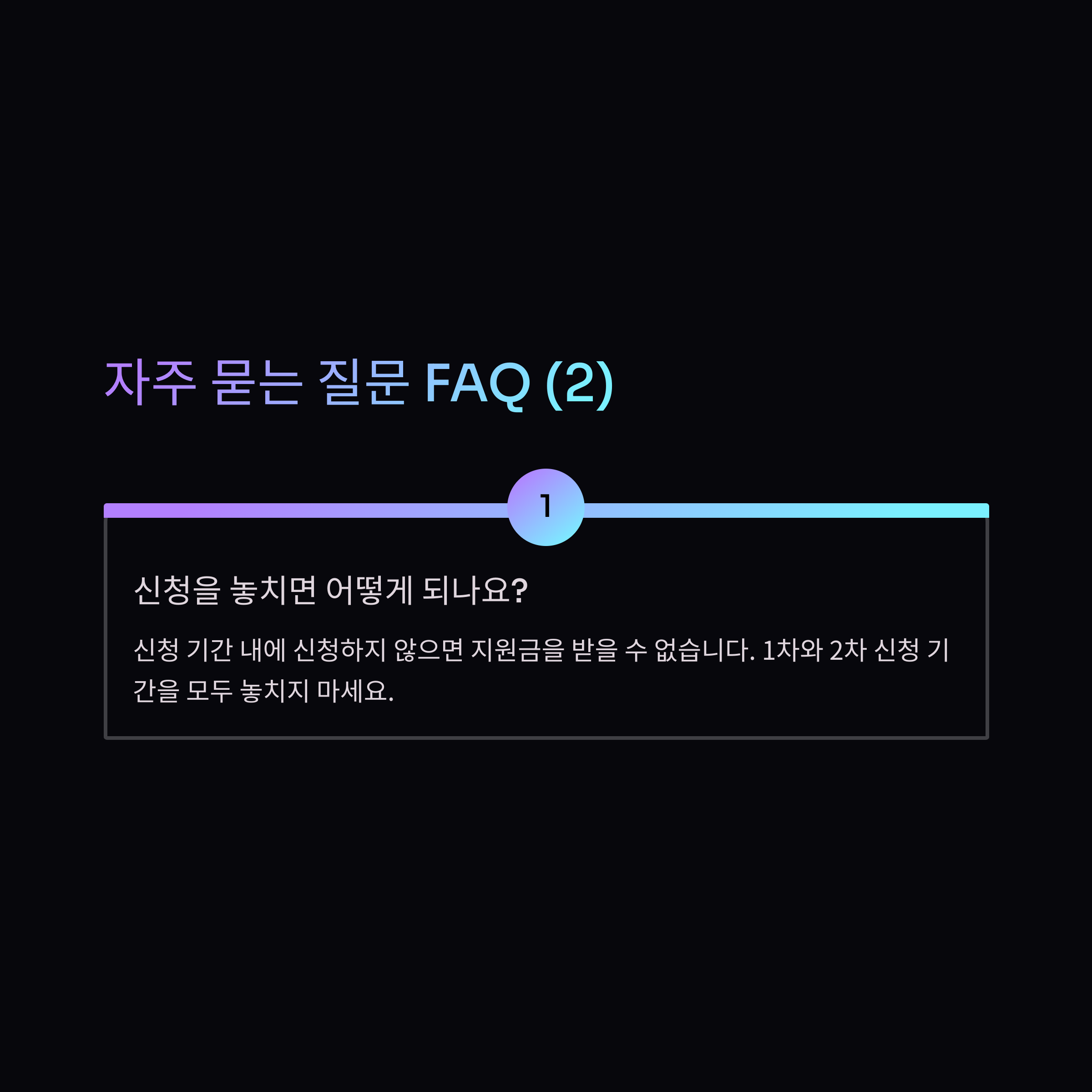 A3: 신청 기간 내에 신청하지 않으면 지원금을 받을 수 없습니다. 1차와 2차 신청 기간을 모두 놓치지 마세요.