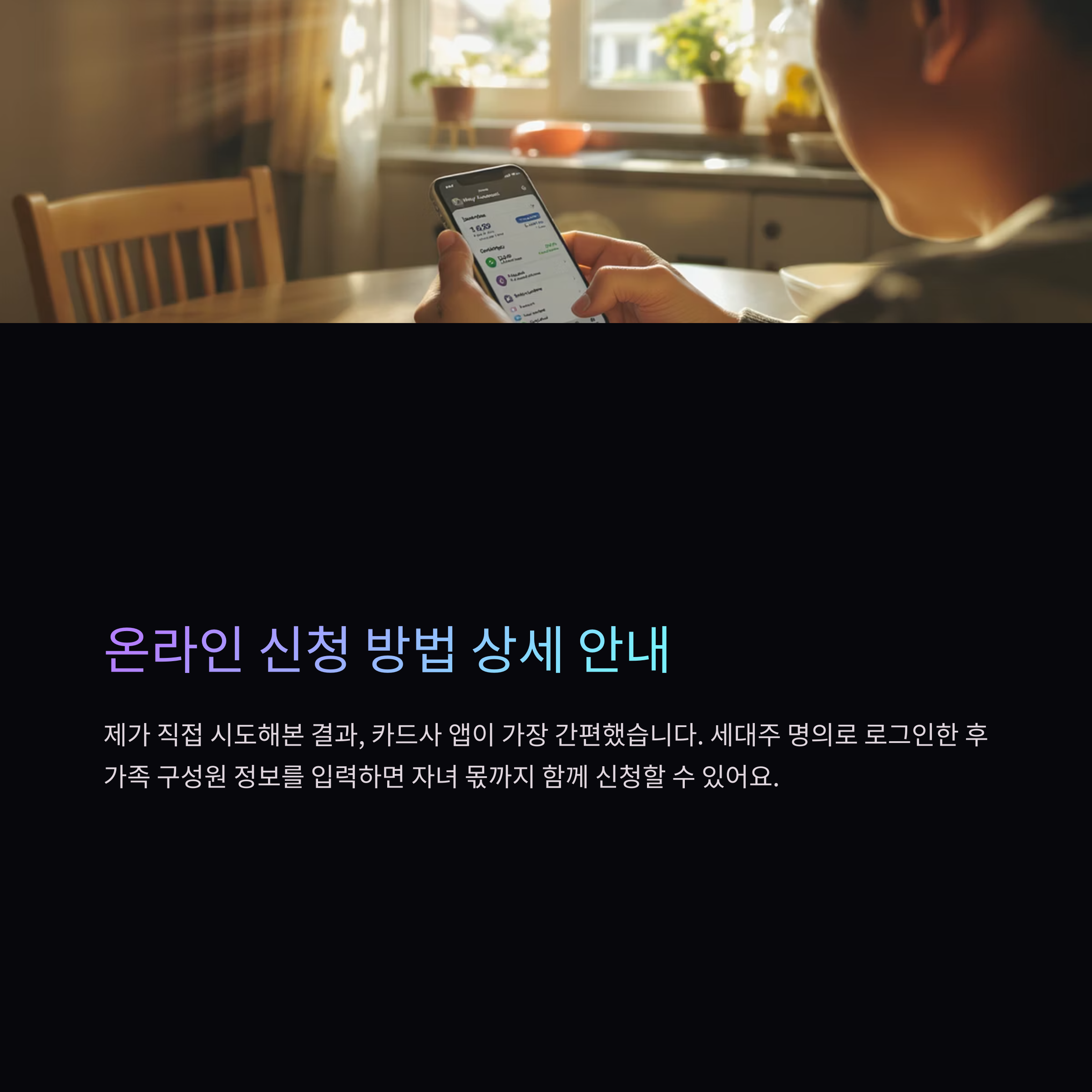 제가 직접 시도해본 결과, 카드사 앱이 가장 간편했습니다. 세대주 명의로 로그인한 후 가족 구성원 정보를 입력하면 자녀 몫까지 함께 신청할 수 있어요.