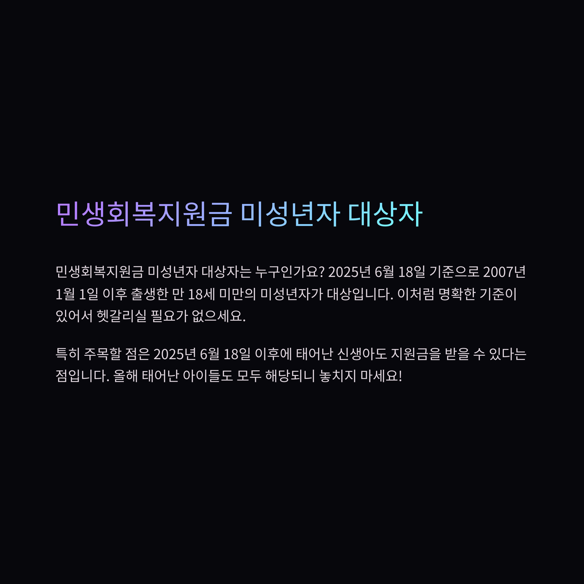 2025년 6월 18일 기준으로 2007년 1월 1일 이후 출생한 만 18세 미만의 미성년자가 대상입니다. 이처럼 명확한 기준이 있어서 헷갈리실 필요가 없으세요.