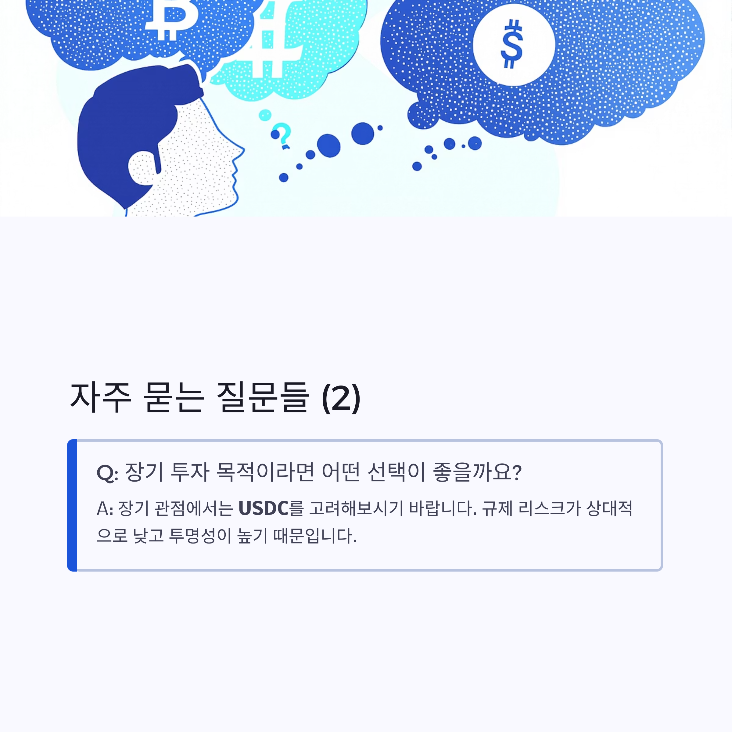 A: 장기 관점에서는 USDC를 고려해보시기 바랍니다. 규제 리스크가 상대적으로 낮고 투명성이 높기 때문입니다.