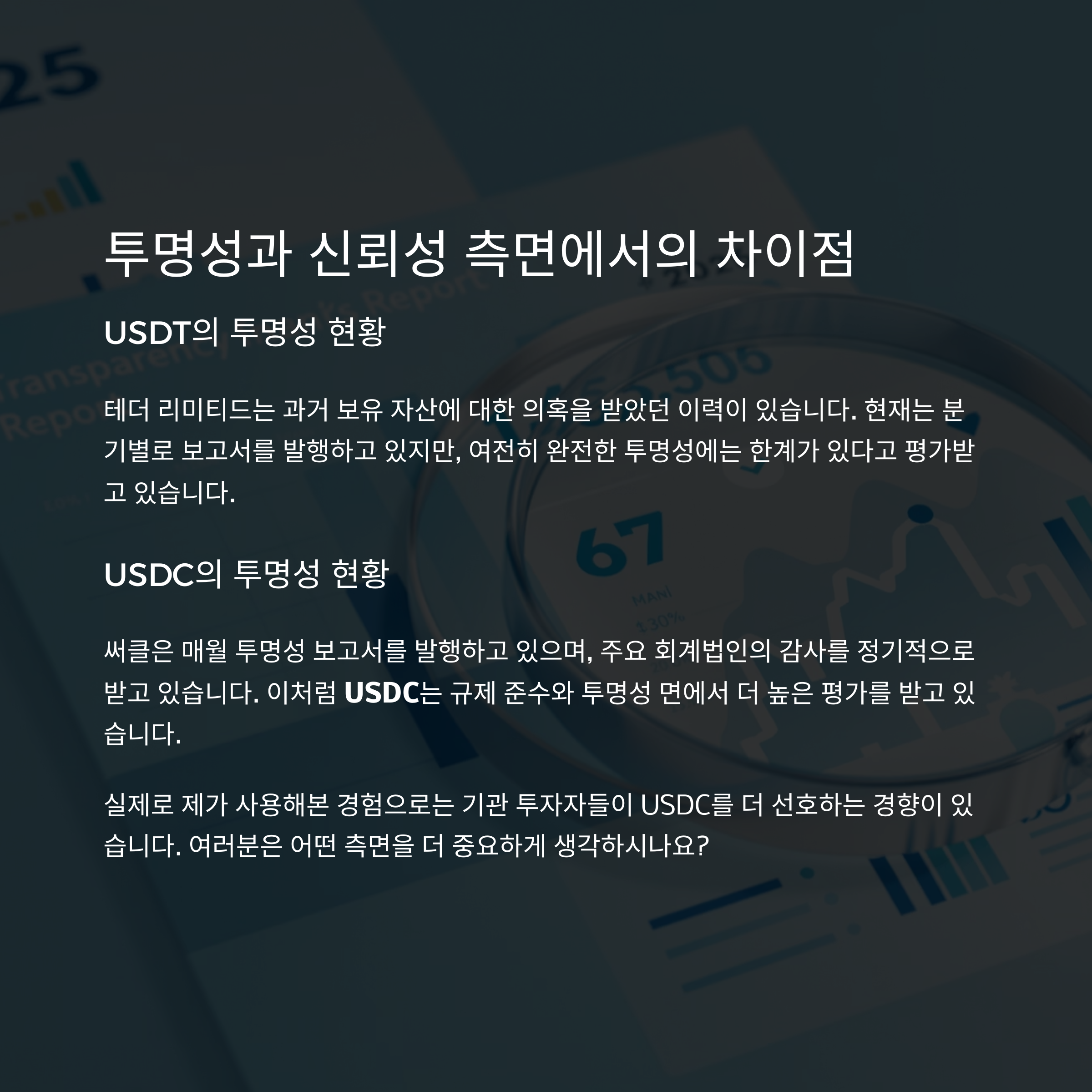 실제로 제가 사용해본 경험으로는 기관 투자자들이 USDC를 더 선호하는 경향이 있습니다. 여러분은 어떤 측면을 더 중요하게 생각하시나요?